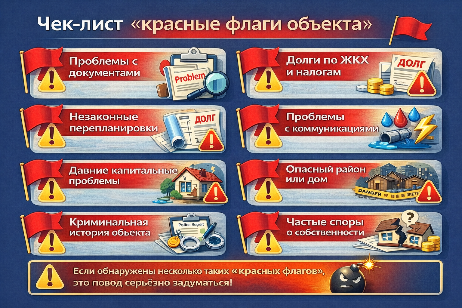 - Юридические сюрпризы – проблемы с документами, правами на собственность или перепланировками могут привести к юридическим спорам.