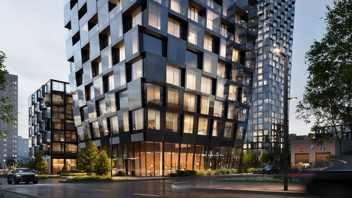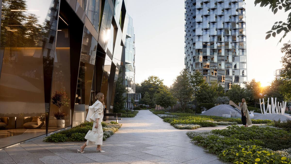 Комплекс состоит из девяти корпусов, включая жилые башни разной этажности, клубные дома, бизнес-центр и коммерческие пространства. Такой контраст форм создаёт динамичный силуэт, а фасады от ADM Architects подчёркивают современный характер проекта. Входные группы с потолками до 6,75 м больше напоминают арт-пространство, чем привычное лобби.