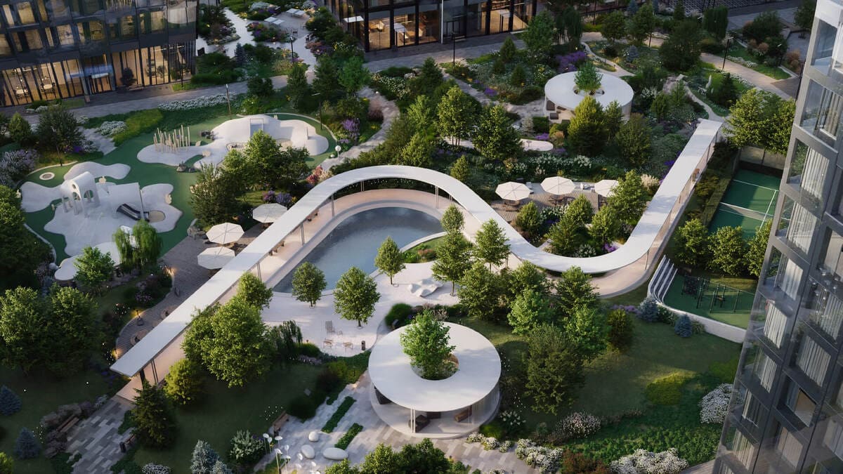 Внутри комплекса – приватный парк с озеленением, водоёмом, lounge-пространствами, зонами для спорта и детскими площадками. Это место, где можно выйти на пробежку утром, поработать с ноутбуком днём или устроить семейную прогулку вечером.