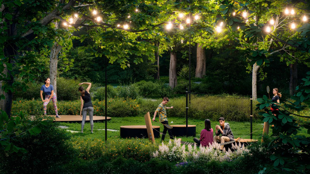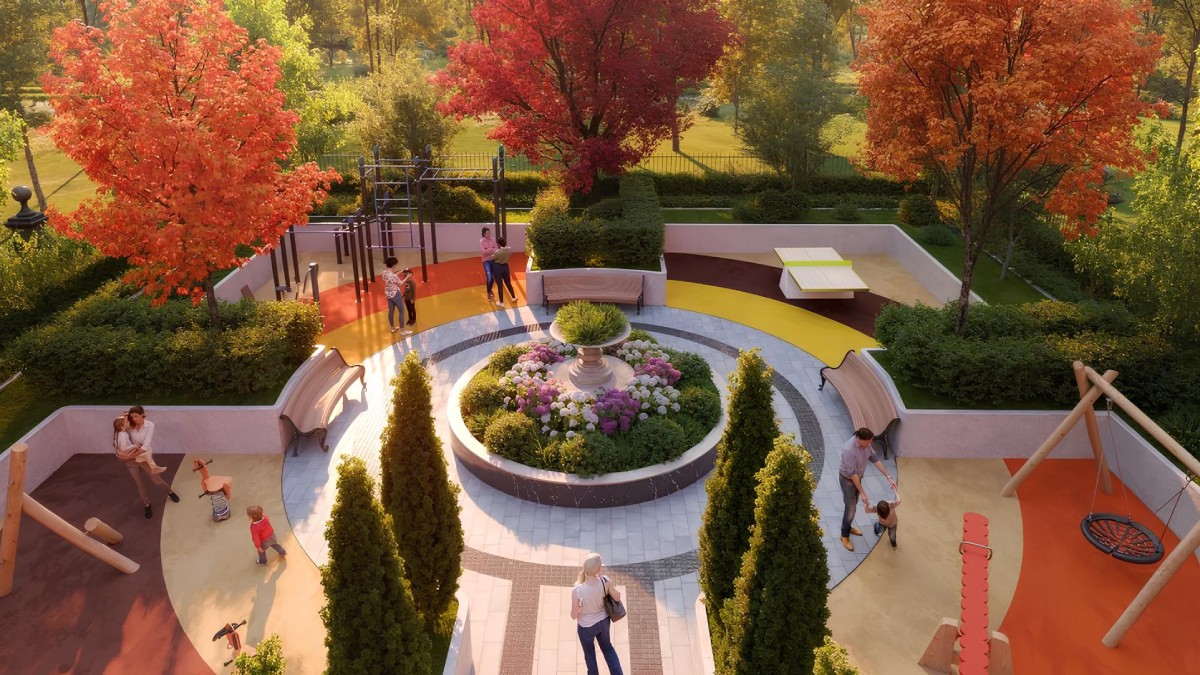 Внизу здание окружает ландшафтный парк площадью 21 гектар. Это не просто двор, а полноценное природное пространство: аллеи для прогулок, зоны отдыха, спортивные и детские площадки.