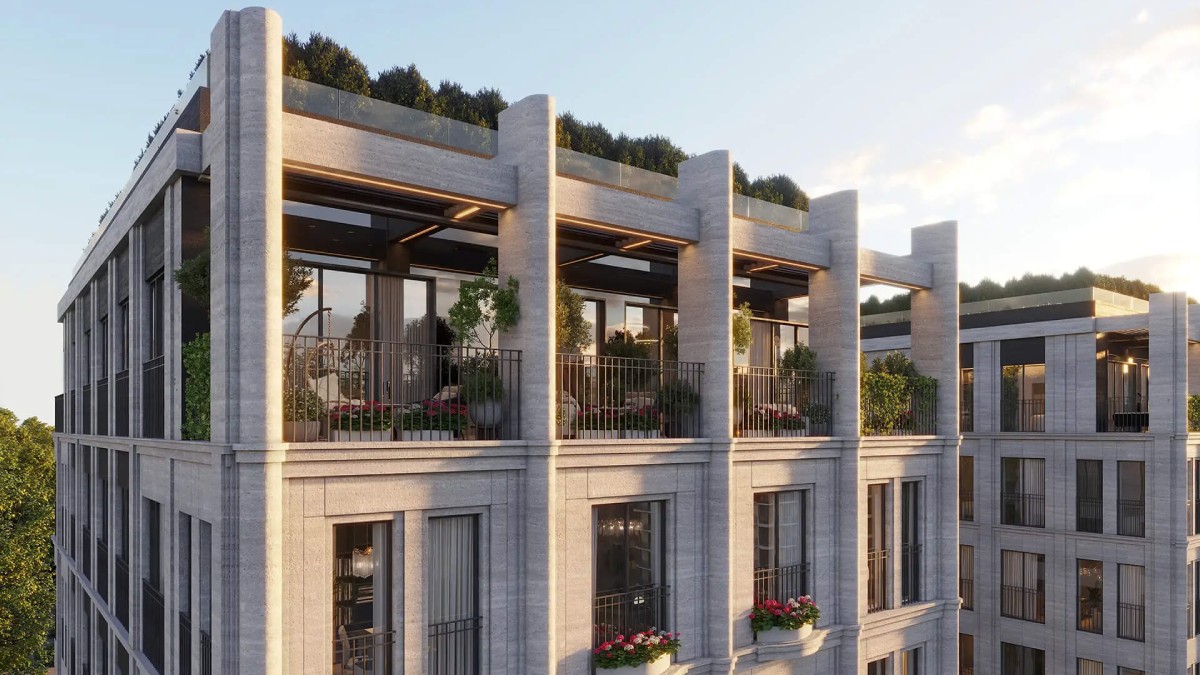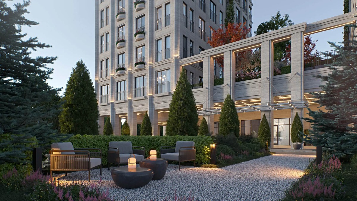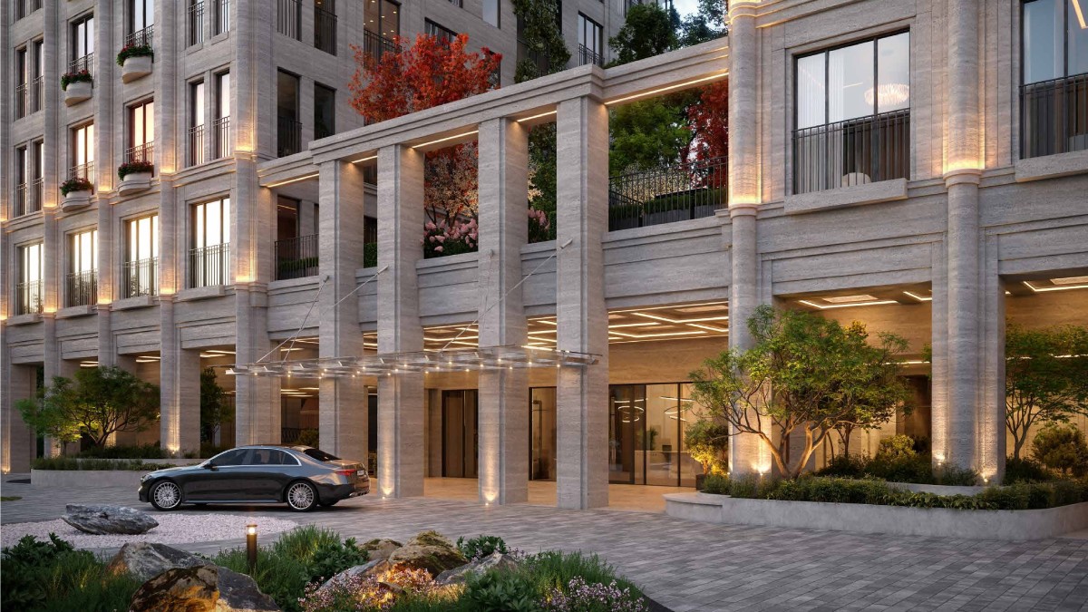 Архитектура проекта выстроена на редком для современного рынка принципе: не стремиться к внешнему эффекту любой ценой, а создавать образ дома, чья ценность раскрывается в пропорциях, материалах и благородстве деталей. Здесь нет демонстративных жестов и нарочитой эффектности. Напротив, фасад из камня светлых оттенков, ритм декоративных вертикалей и колонная галерея формируют сдержанный и выразительный образ, отсылающий к эстетике классической городской резиденции.