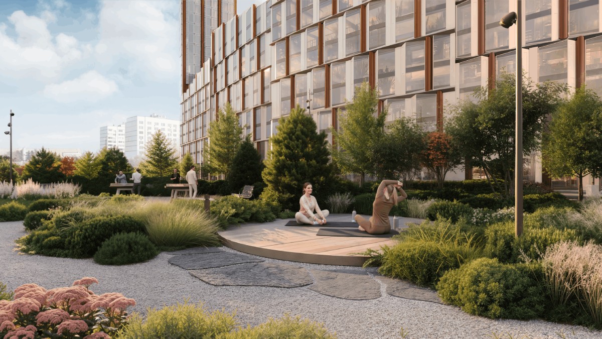 Здесь предусмотрены пространства для размышлений и работы, арт-объекты, природные материалы, амфитеатр, лужайка для йоги и коворкинг под открытым небом. Покупатель получает не только красивый двор, но и среду, которая становится частью его повседневного сценария жизни.