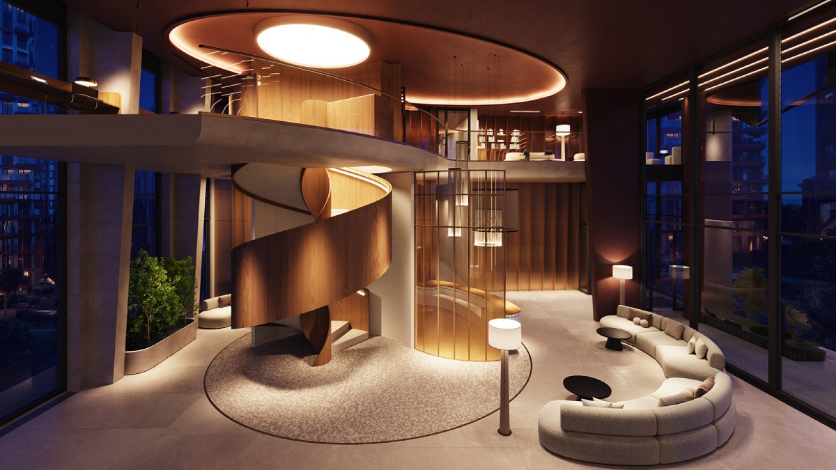 Здесь предусмотрены сквозные лобби, лаунж-зоны, подогрев пешеходных дорожек по периметру здания, а также двухсветное мастер-лобби с панорамным остеклением, авторской мебелью и парадной лестницей. Площадь этого пространства составляет 160 квадратных метров, высота потолков – 6 метров.