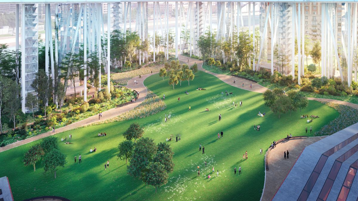 Прямо под «домом в воздухе» – новый городской парк в концепции «русский лес»: большая зеленая лужайка, прогулочные и беговые дорожки, детские площадки и домики на деревьях, зоны отдыха.