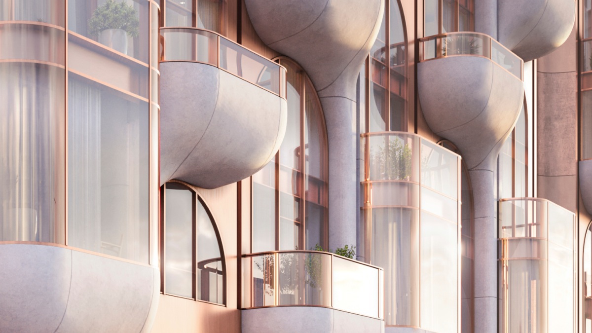 Фасады словно «стеклянный лес» с панорамными окнами и медными акцентами создают ощущение лёгкости, а бионические балконы в форме лепестков придают дому динамику.