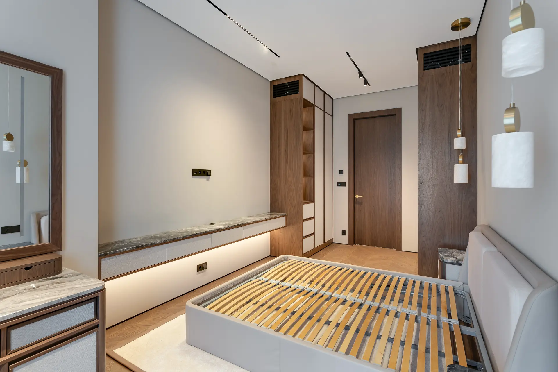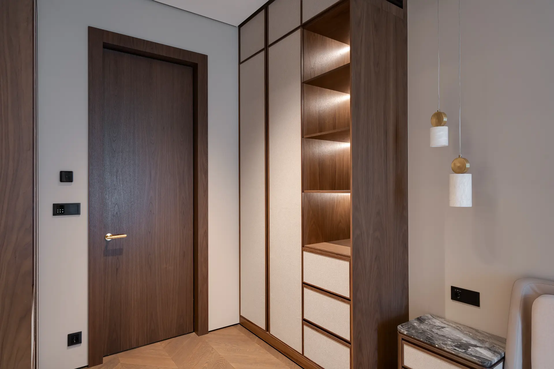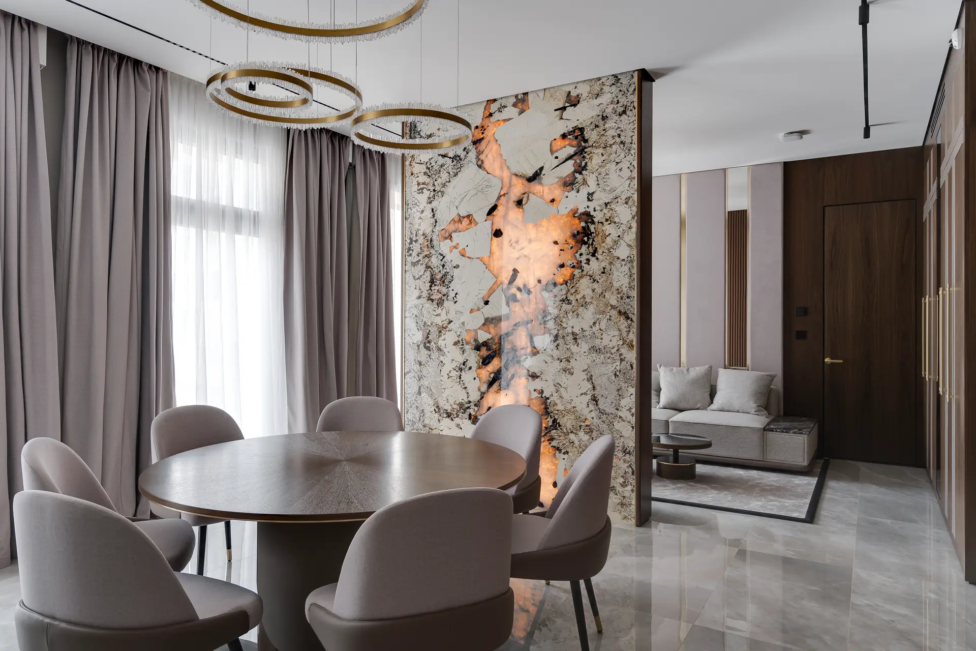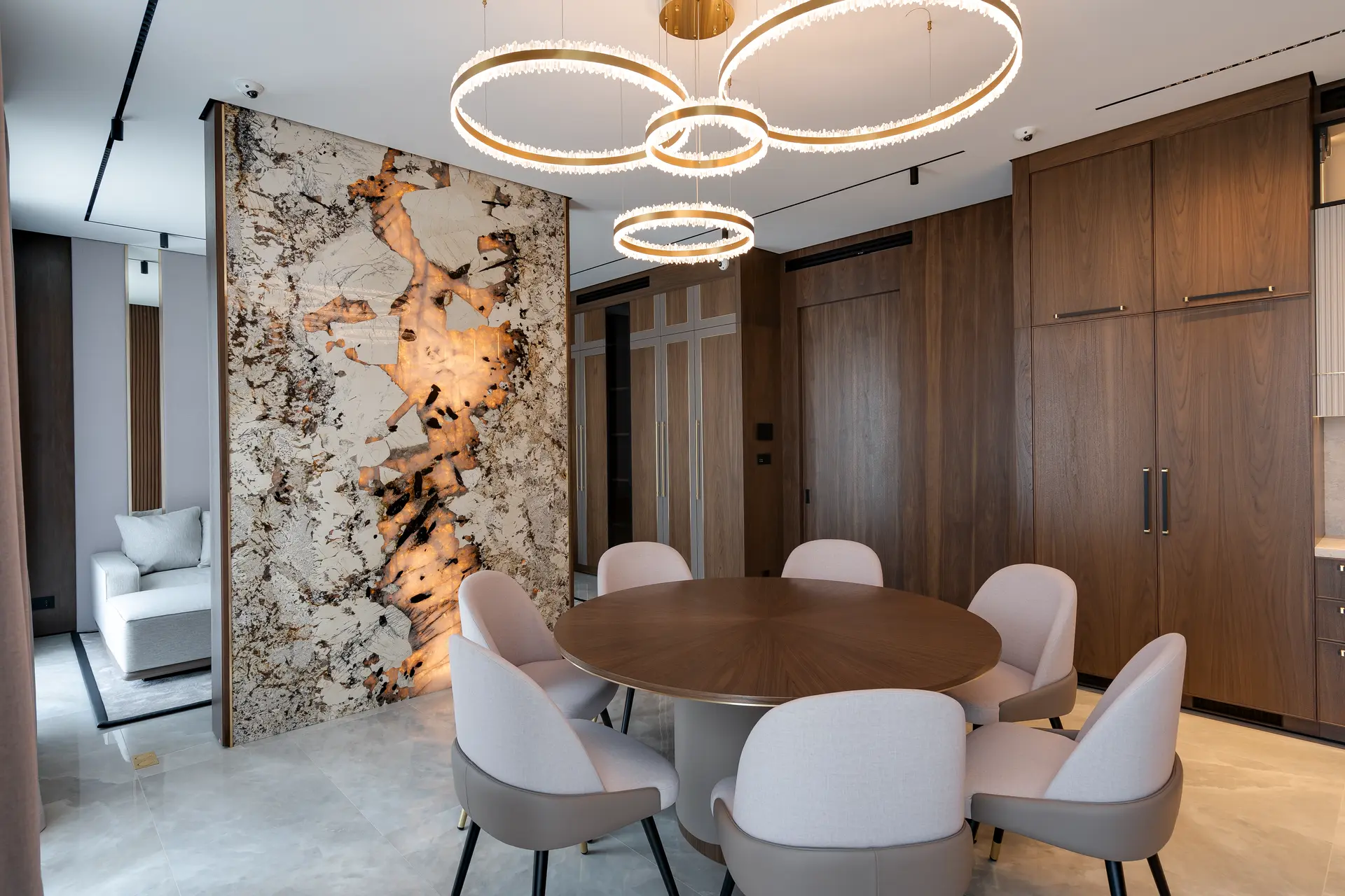 Интерьер выполнен по дизайнерскому проекту в современном стиле с использованием дорогих натуральных материалов: ценные породы дерева, мрамор Versace, натуральный камень, замша. Квартира укомплектована мебелью ведущих европейских фабрик и бытовой техникой премиум-класса Liebherr, KUPPERSBUSCH, а также стиральной и сушильной машинами Asko.
