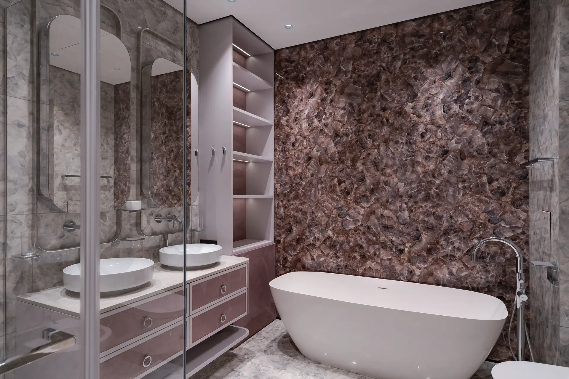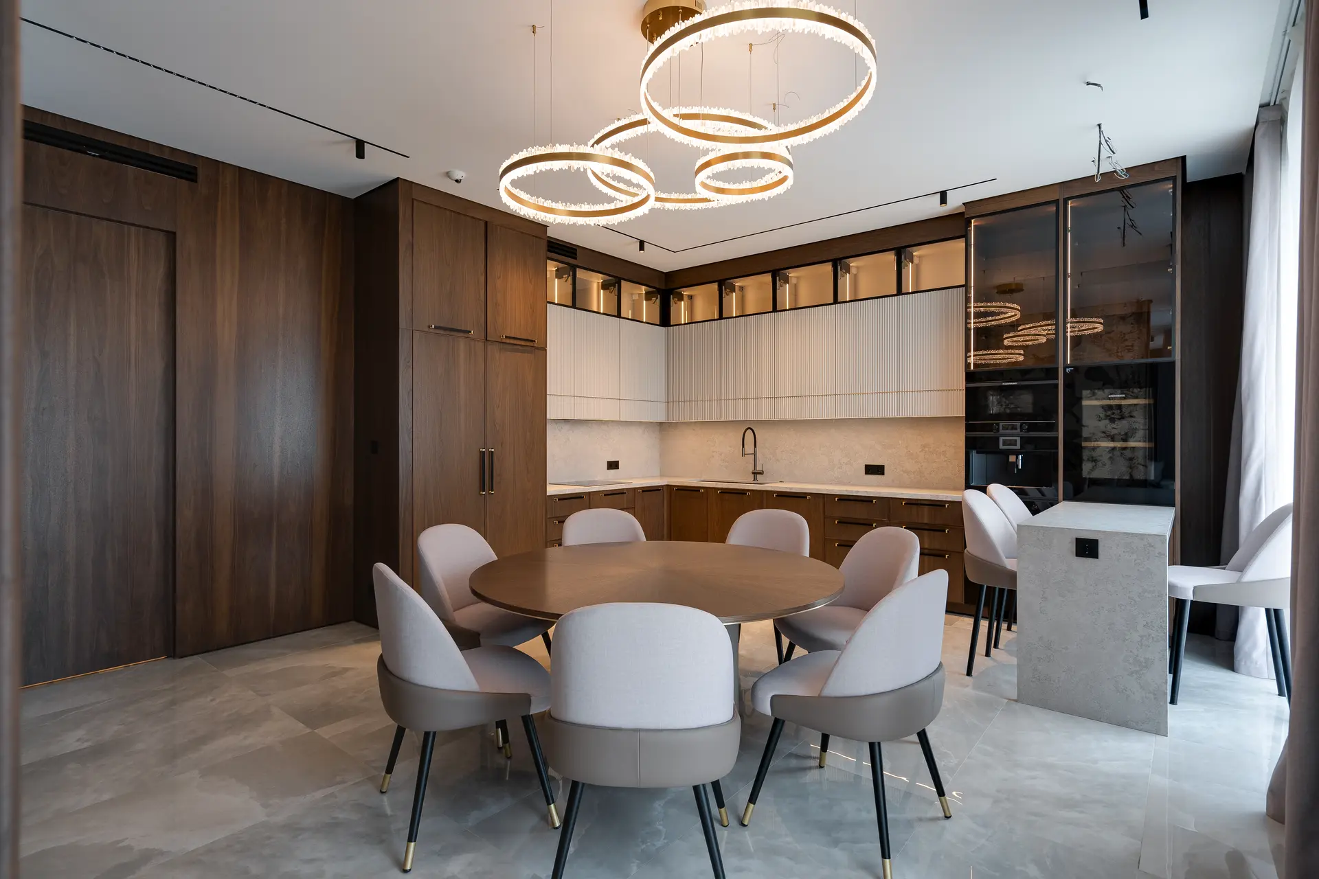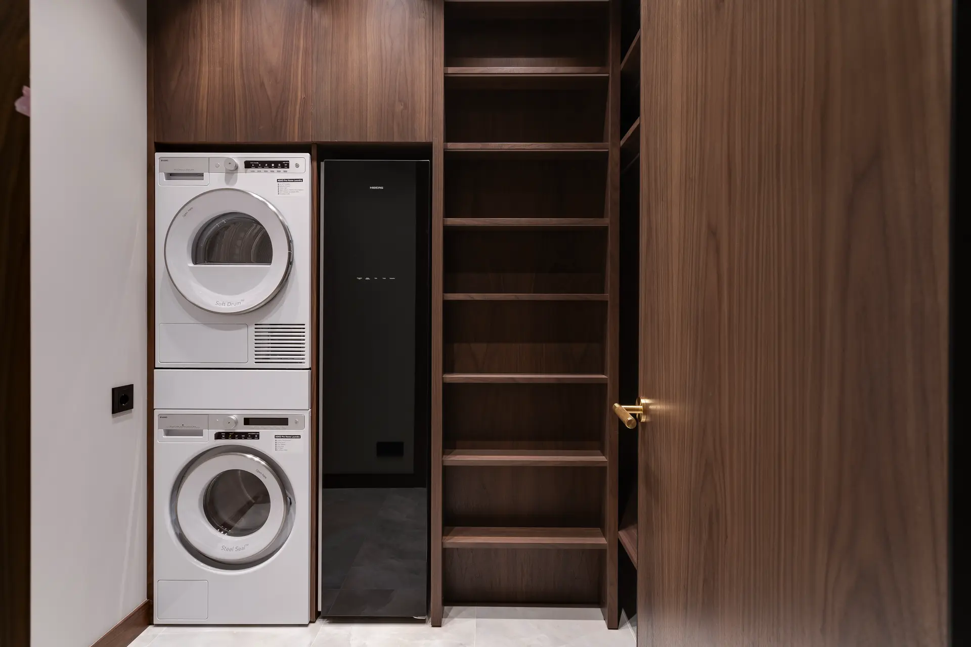 Интерьер выполнен по дизайнерскому проекту в современном стиле с использованием дорогих натуральных материалов: ценные породы дерева, мрамор Versace, натуральный камень, замша. Квартира укомплектована мебелью ведущих европейских фабрик и бытовой техникой премиум-класса Liebherr, KUPPERSBUSCH, а также стиральной и сушильной машинами Asko.