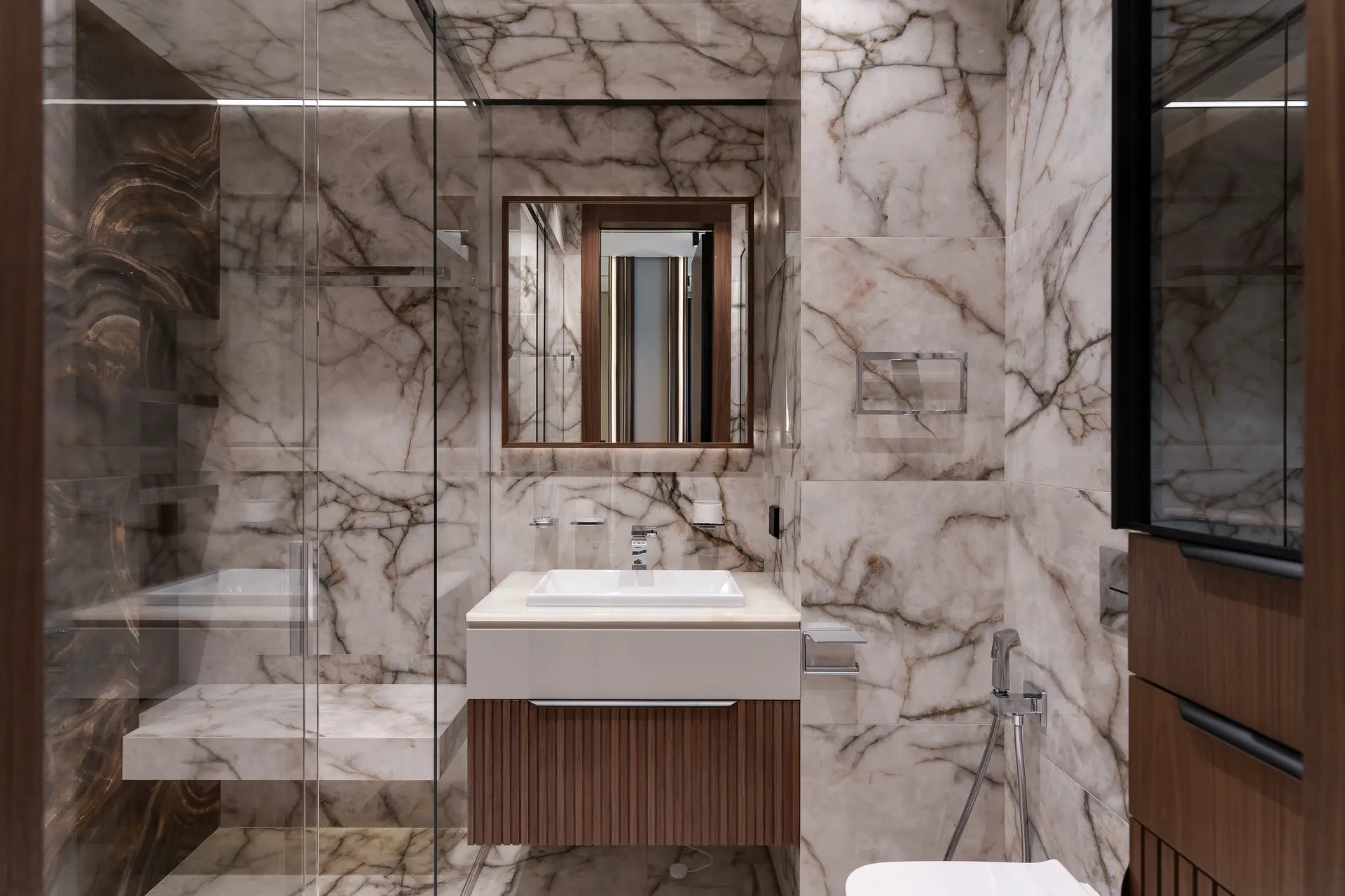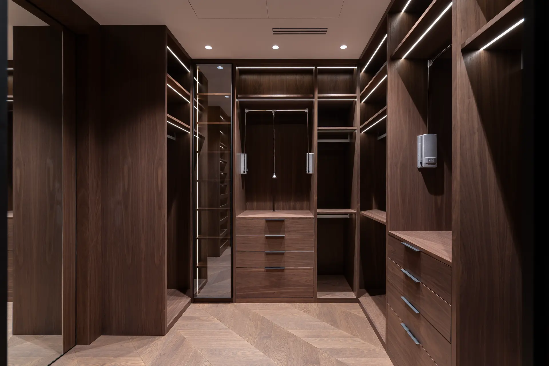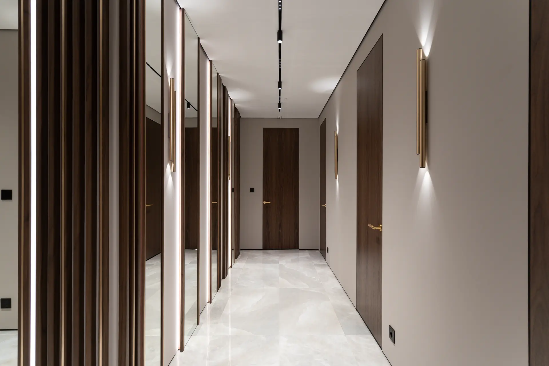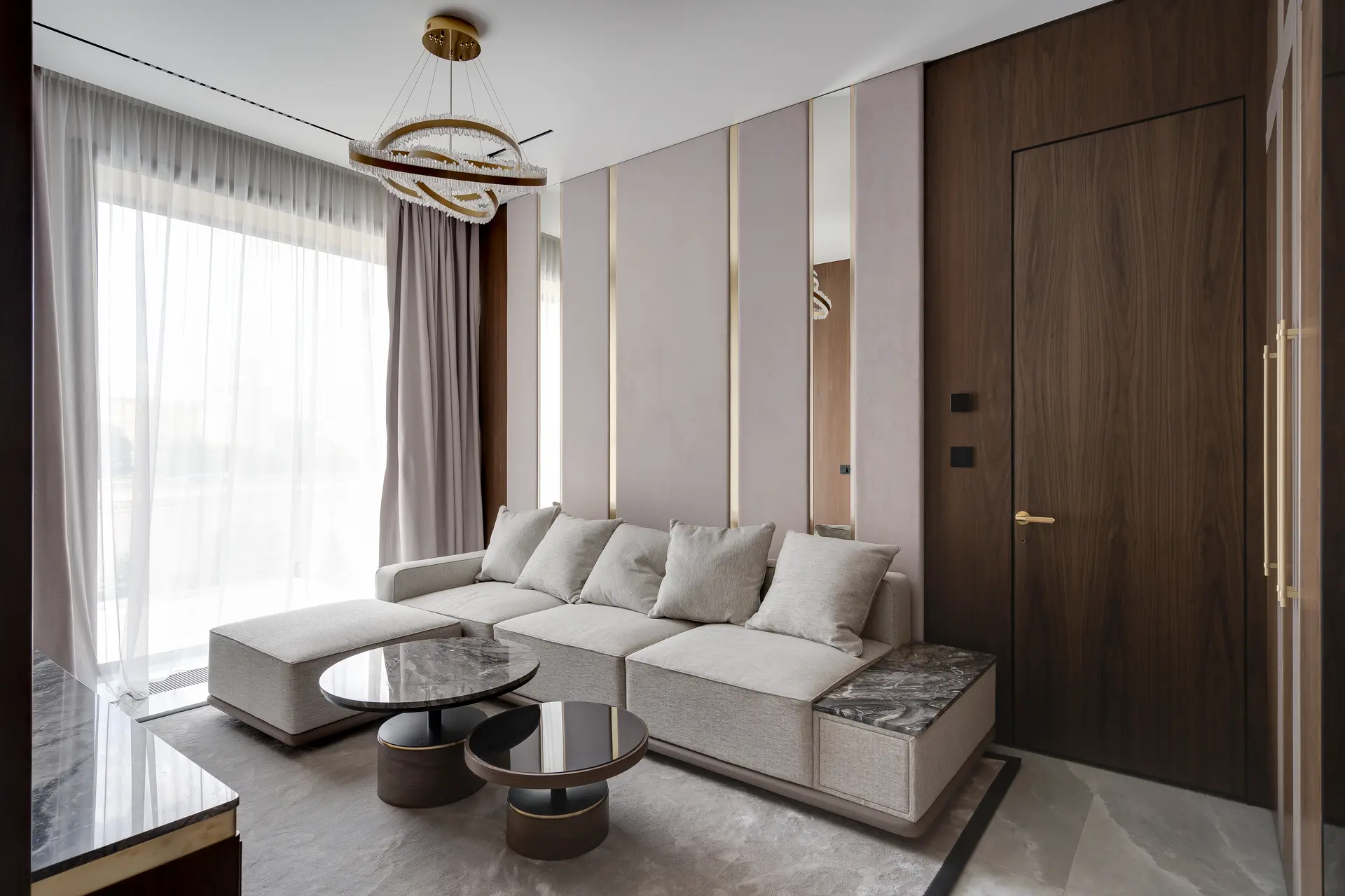 Интерьер выполнен по дизайнерскому проекту в современном стиле с использованием дорогих натуральных материалов: ценные породы дерева, мрамор Versace, натуральный камень, замша. Квартира укомплектована мебелью ведущих европейских фабрик и бытовой техникой премиум-класса Liebherr, KUPPERSBUSCH, а также стиральной и сушильной машинами Asko.