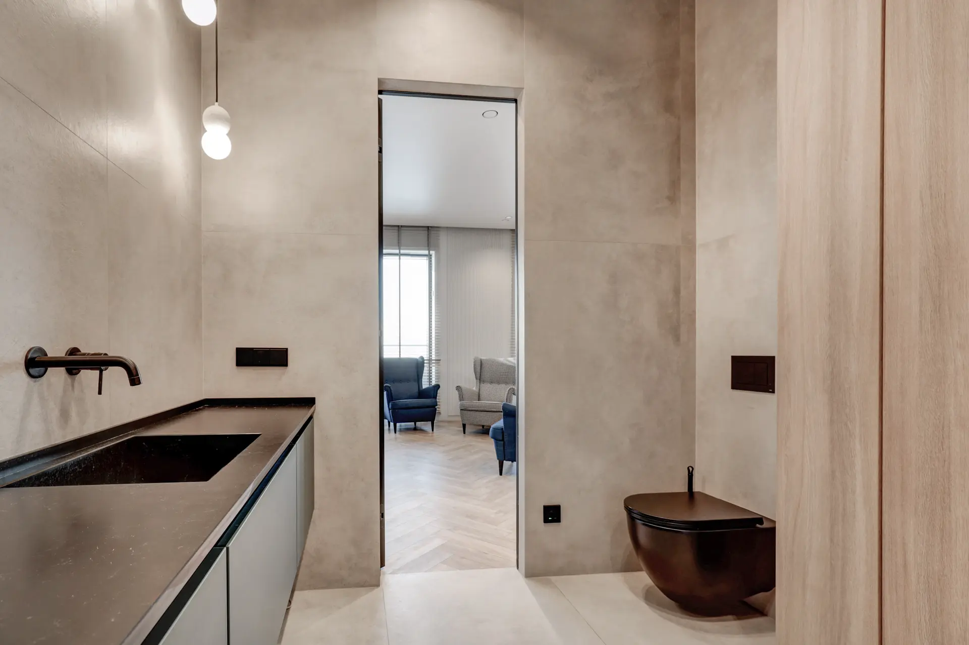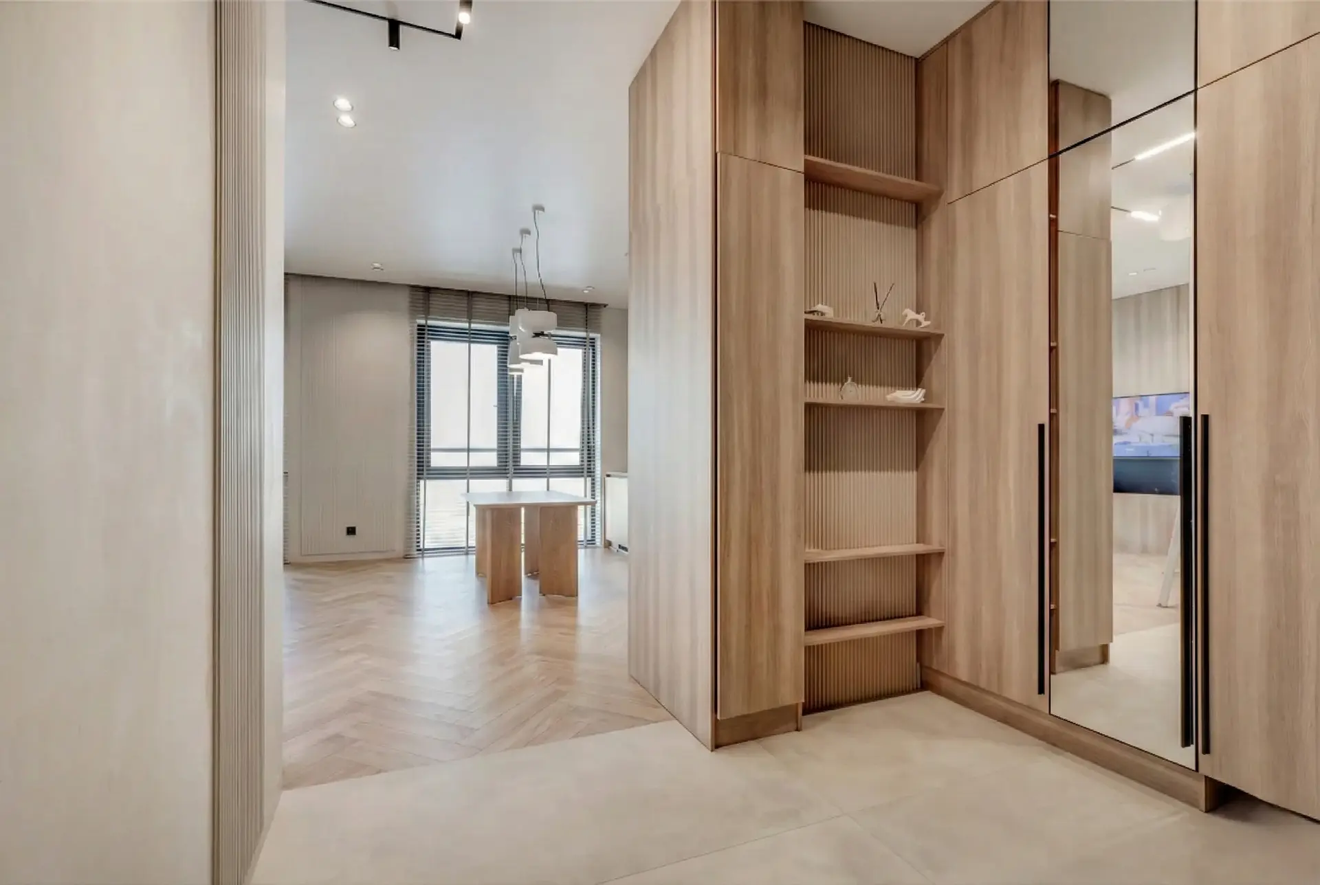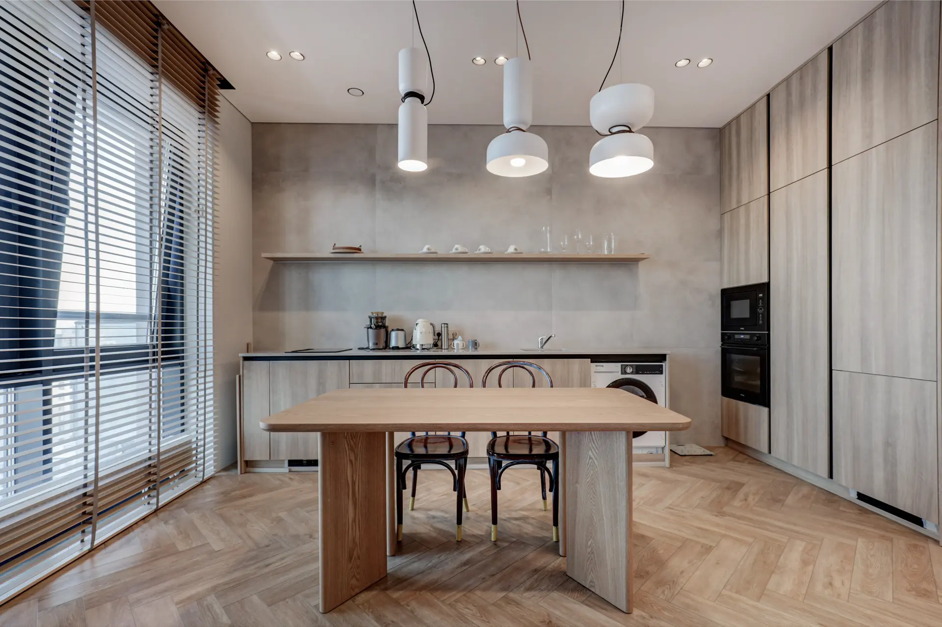 Интерьер выполнен по дизайнерскому проекту с премиальной отделкой. В квартире установлены кондиционеры с режимами холод/тепло, система защиты от протечек и скачков напряжения, электрошторы, техника Korting и мебель с фурнитурой Blum.