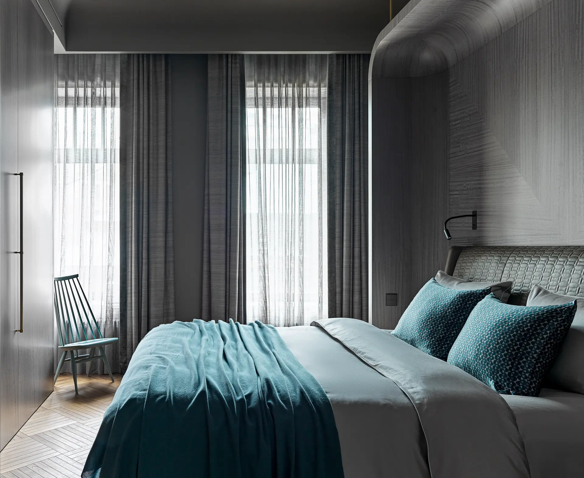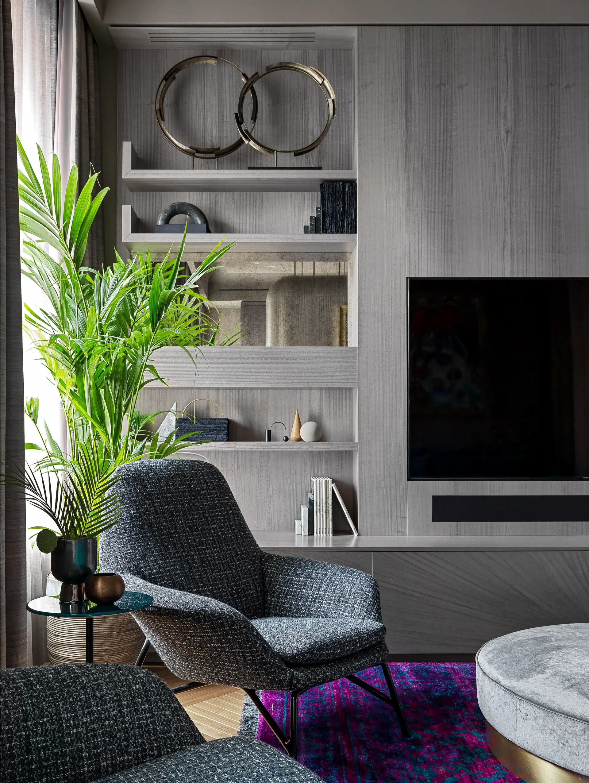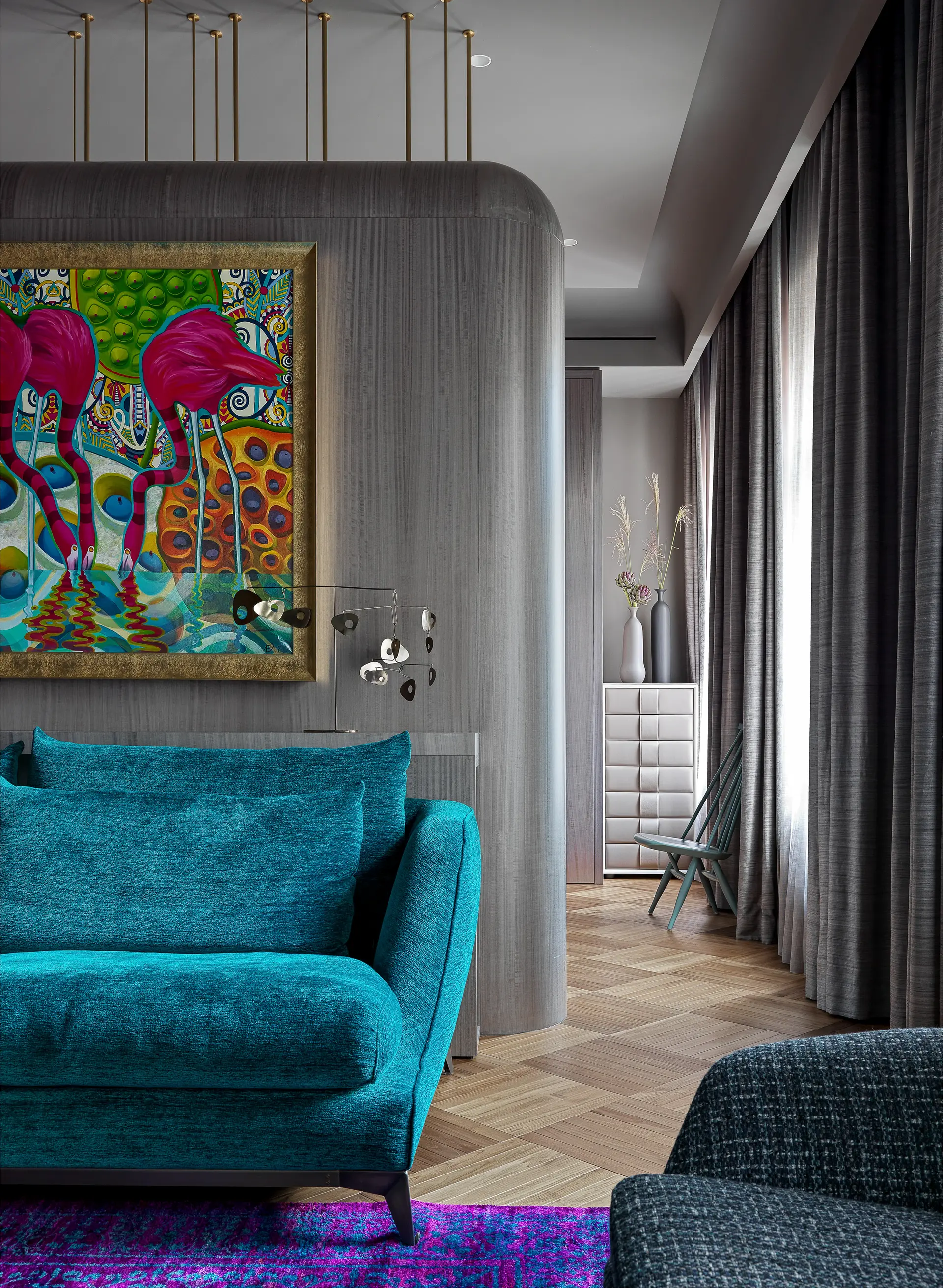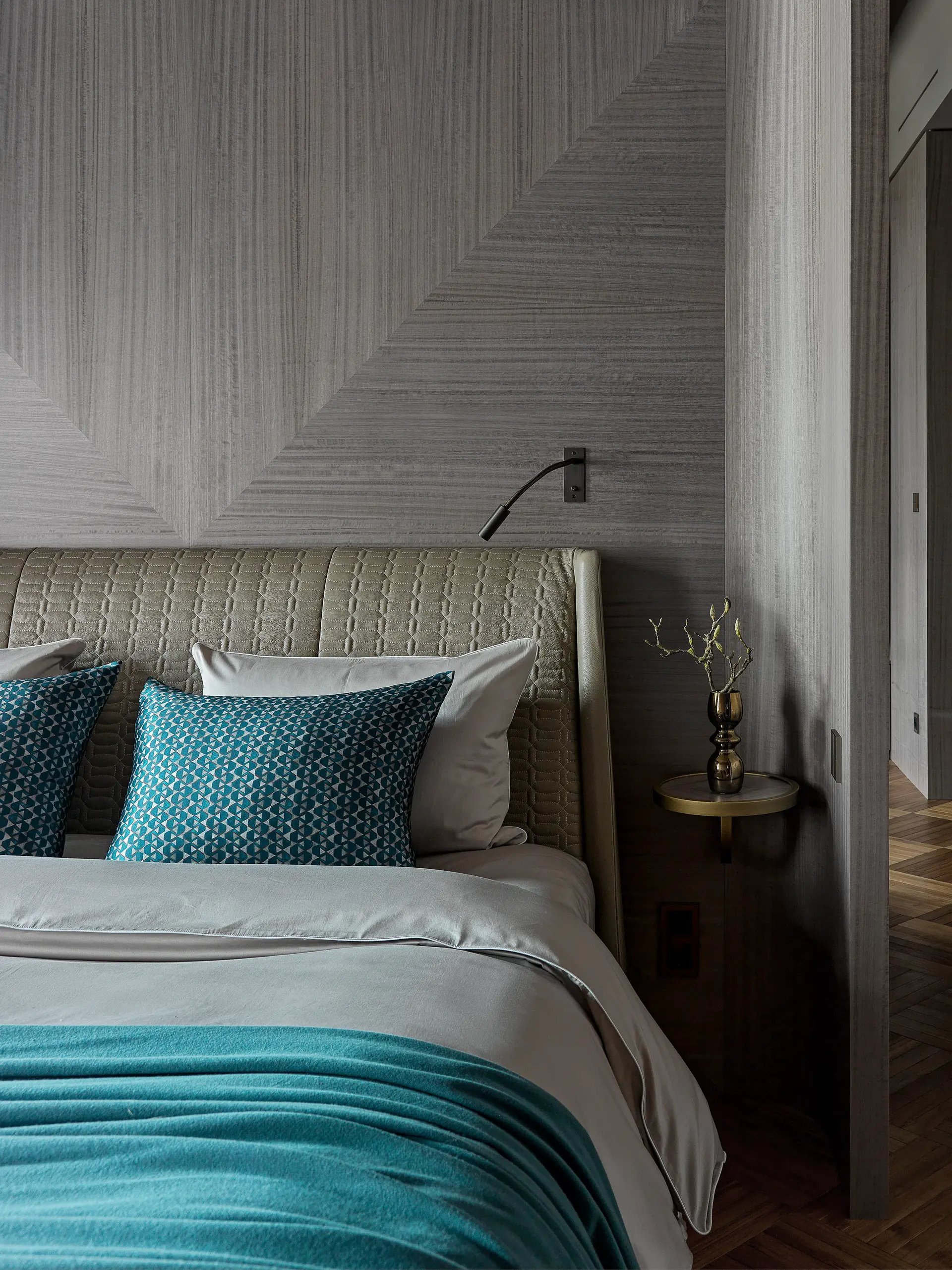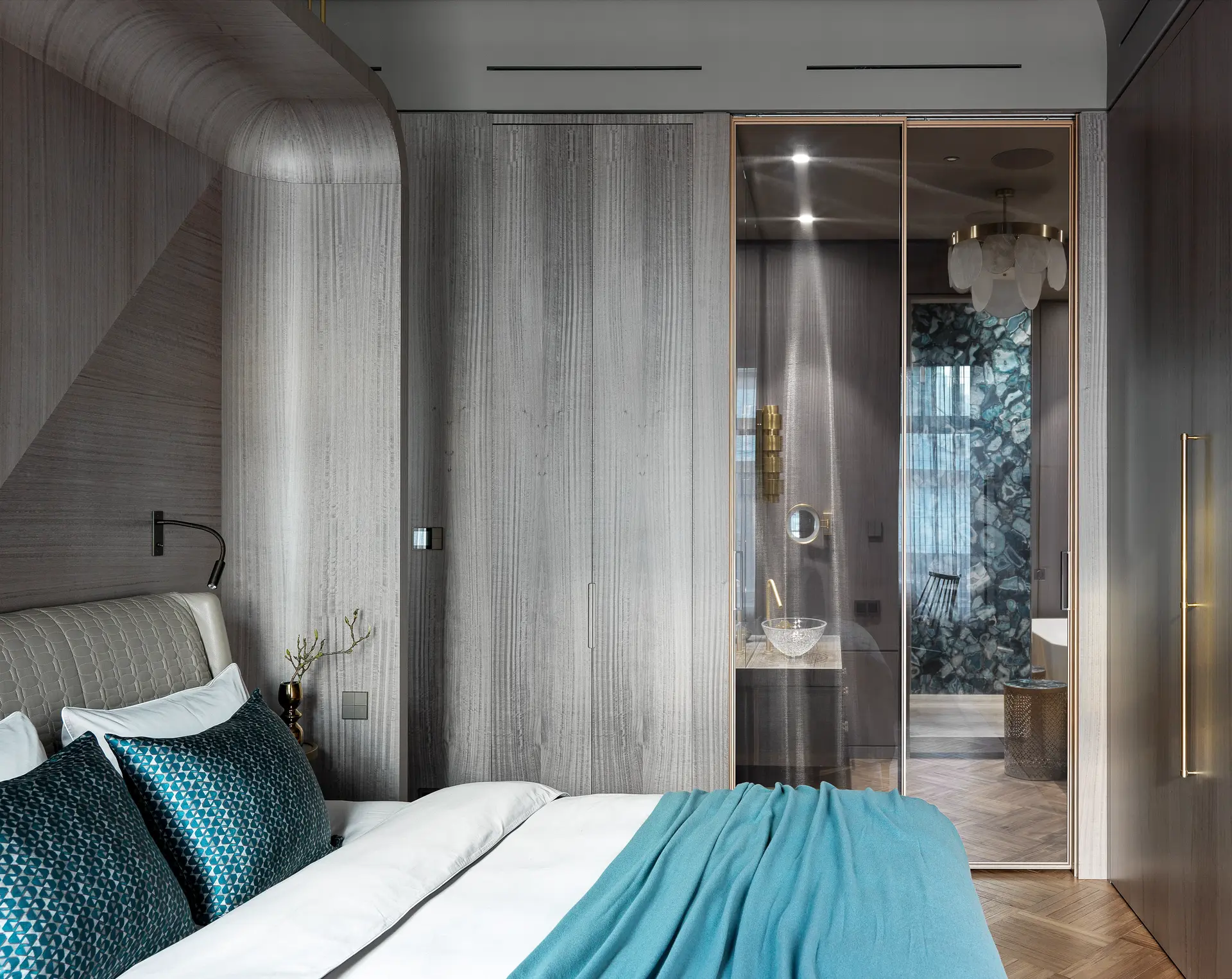 Планировка выстроена максимально рационально: гостиная с мебелью Baxter и Minotti объединена с кухней Valcucine площадью 18 м², отдельная спальня с кроватью Poltrona Frau, гардеробная Rimadesio и два полноценных санузла. В отделке использован тиковый паркет, подчёркивающий тепло и благородство интерьера.