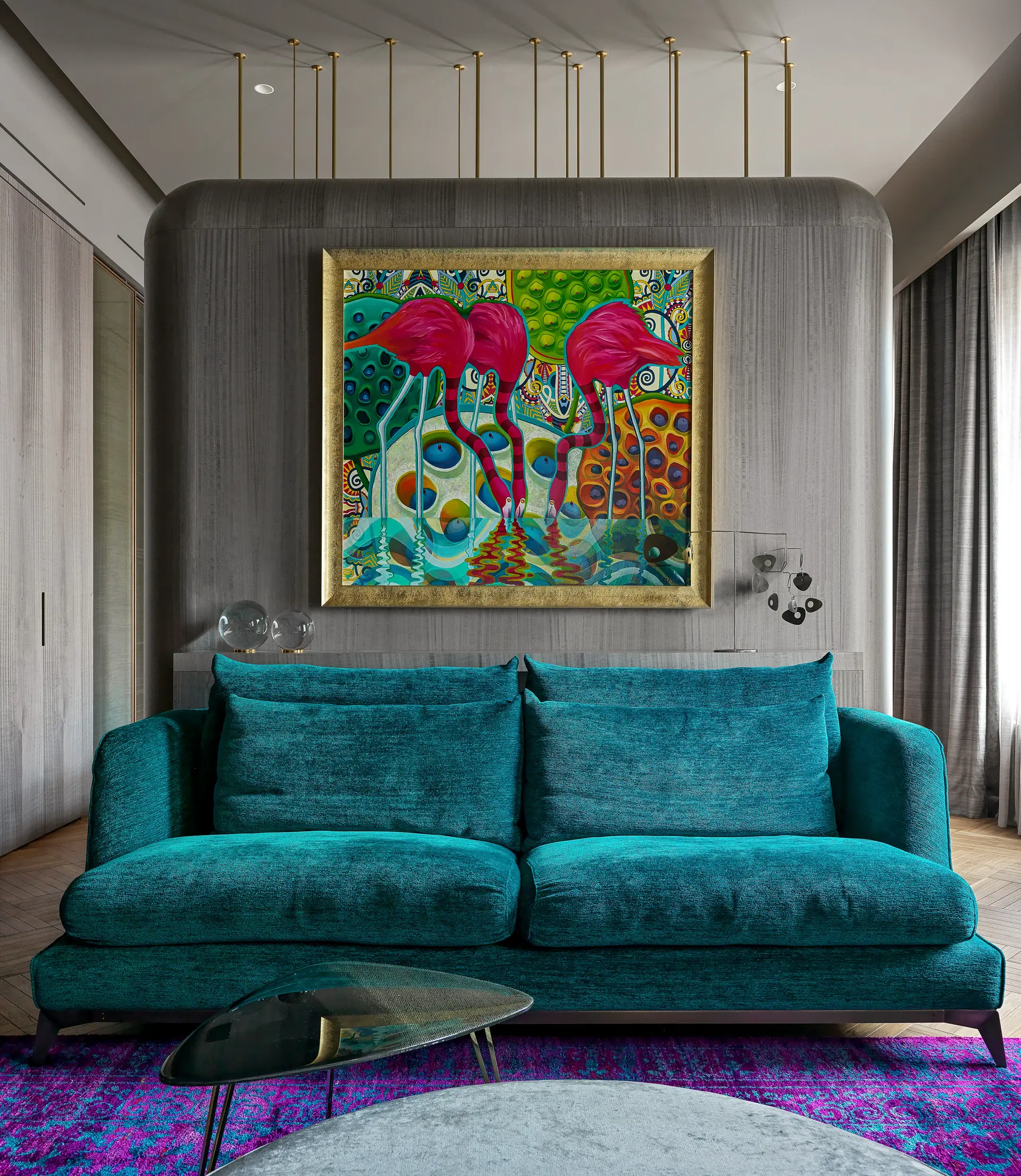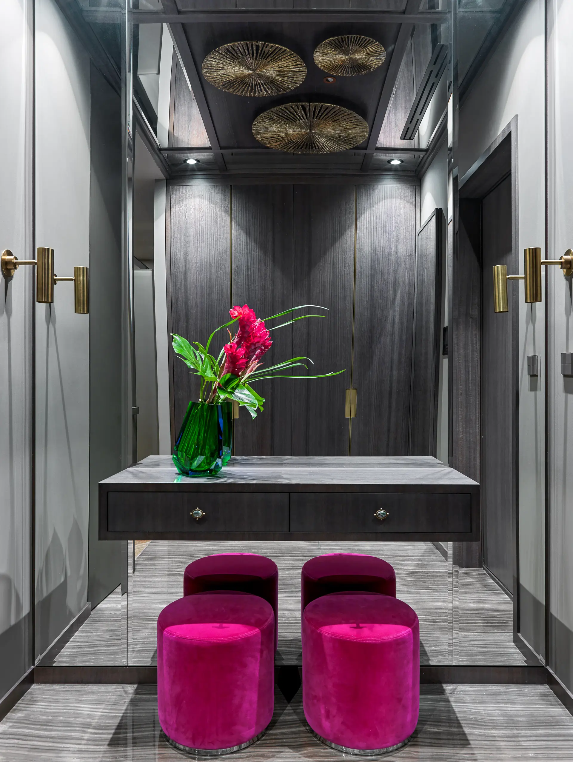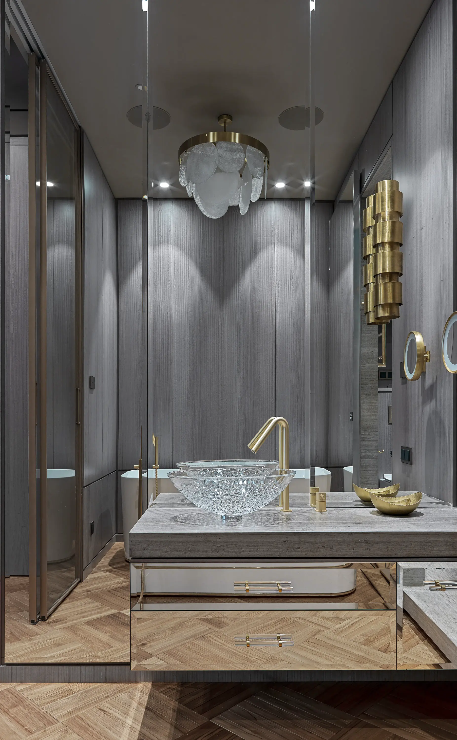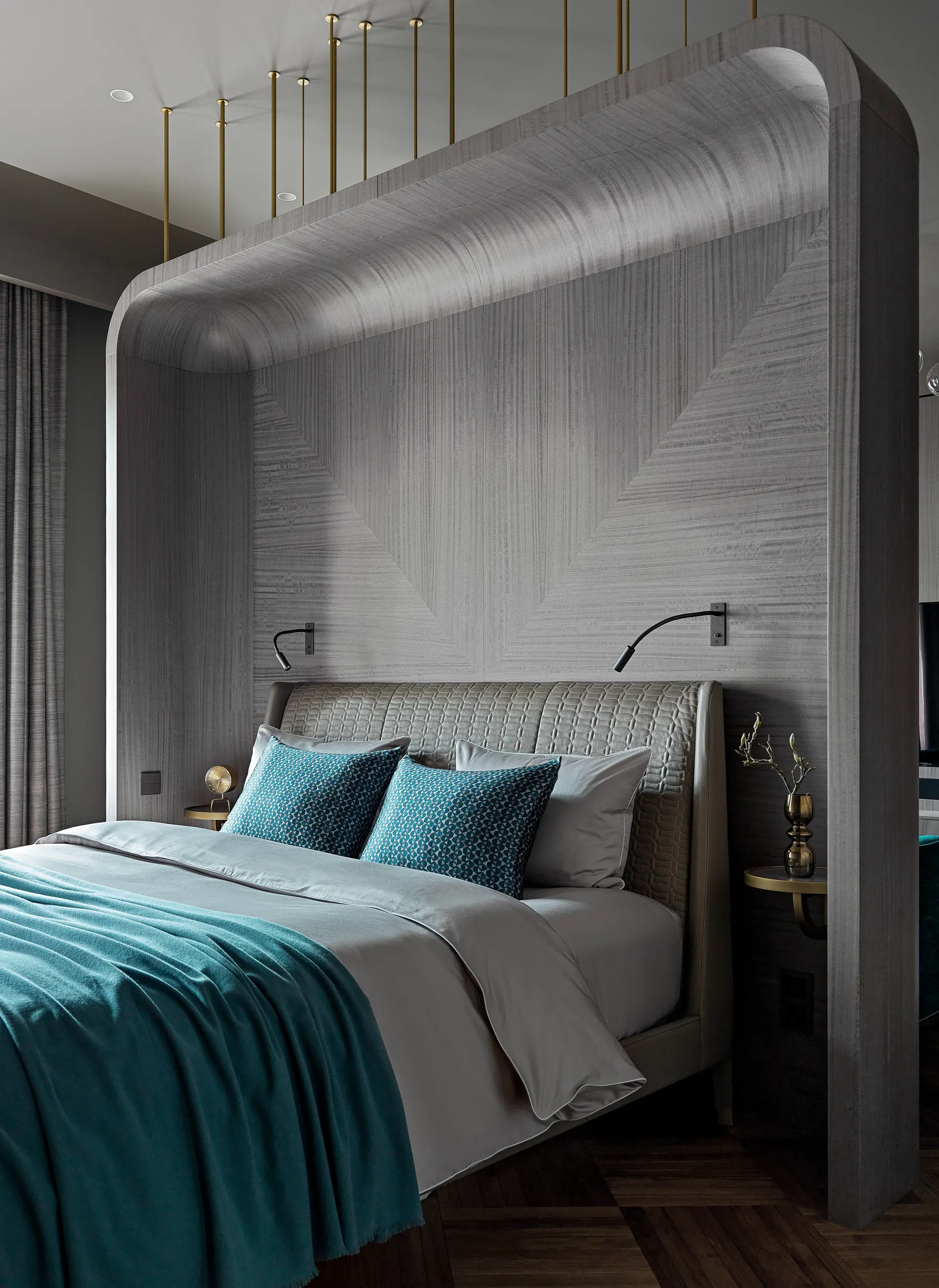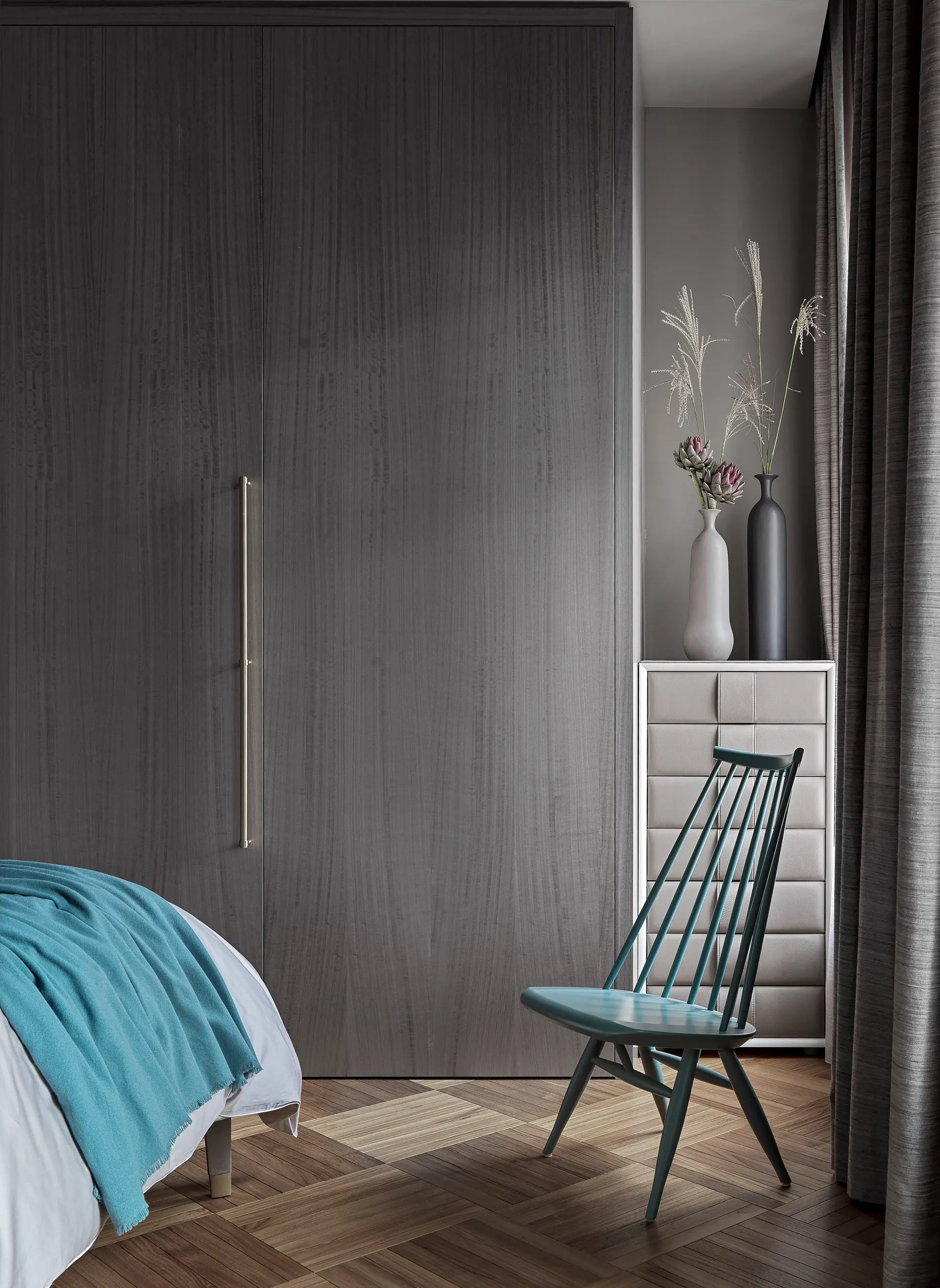 Планировка выстроена максимально рационально: гостиная с мебелью Baxter и Minotti объединена с кухней Valcucine площадью 18 м², отдельная спальня с кроватью Poltrona Frau, гардеробная Rimadesio и два полноценных санузла. В отделке использован тиковый паркет, подчёркивающий тепло и благородство интерьера.