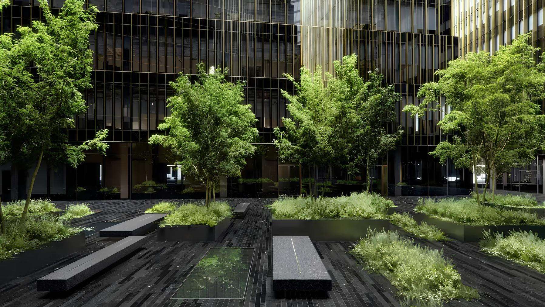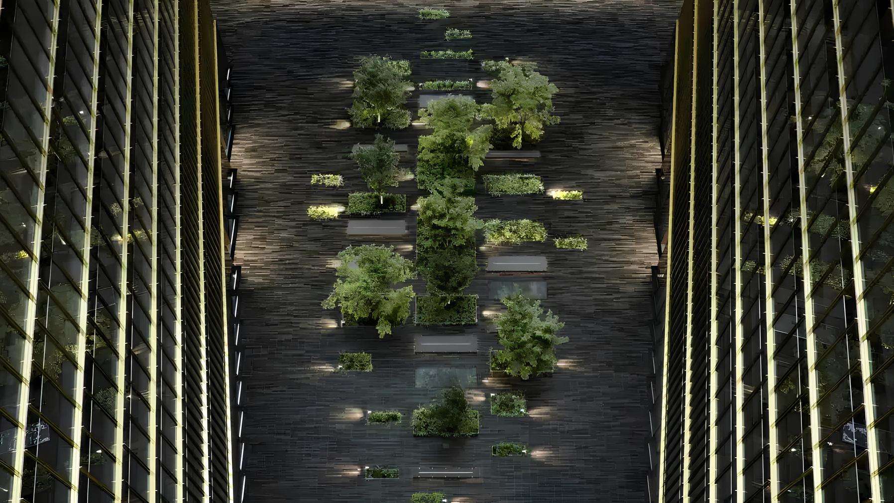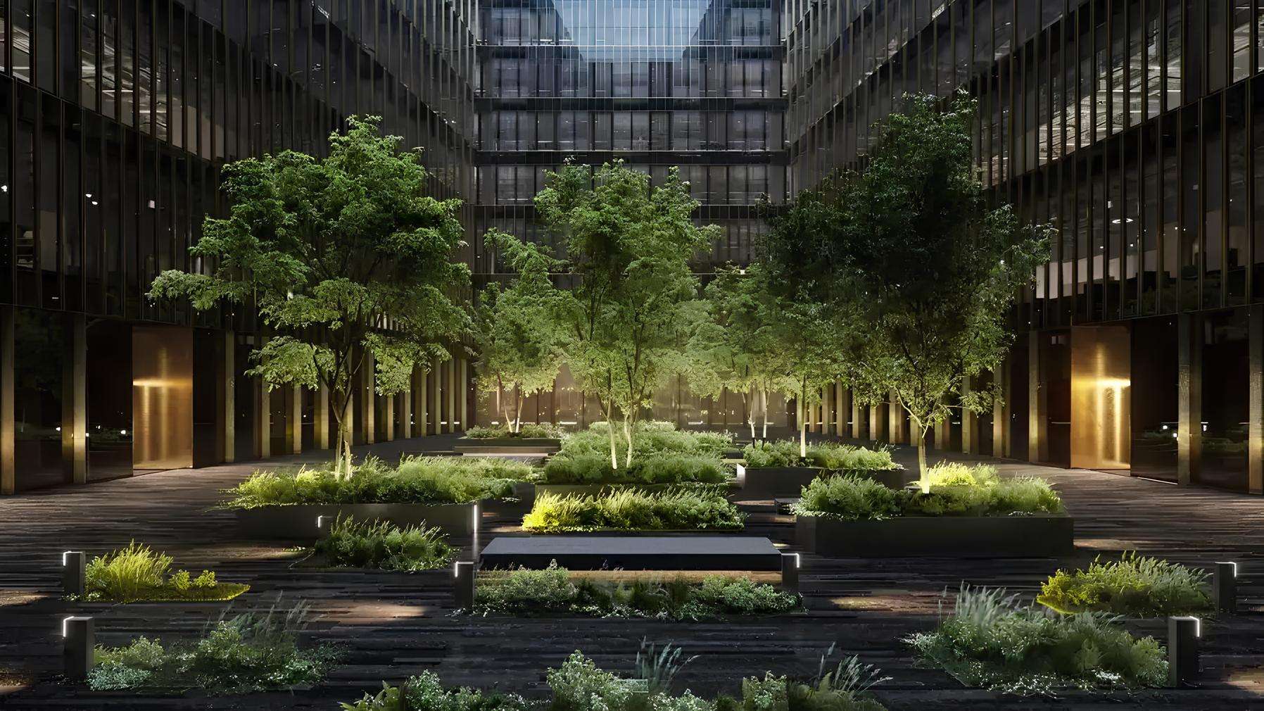 Приватный внутренний двор является продолжением архитектурной концепции проекта, подчеркивая его премиальный статус. В этом спокойном пространстве организованы зоны с сезонным озеленением, продуманным освещением и малыми архитектурными формами, что создаёт атмосферу приватности и уюта.