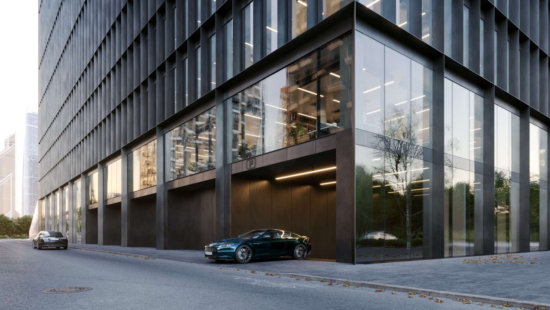 Фасады здания выполнены в акцентной монохромной графитово-чёрной палитре с большой площадью зеркального остекления, что создает эффект лёгкости.