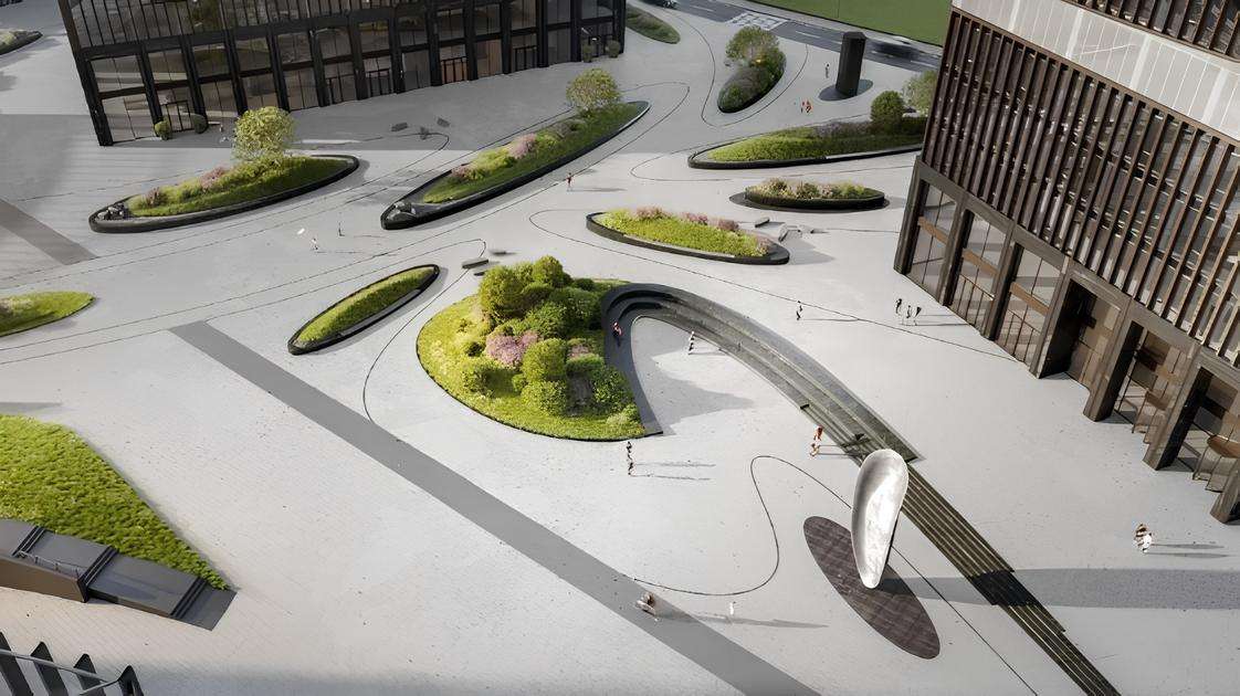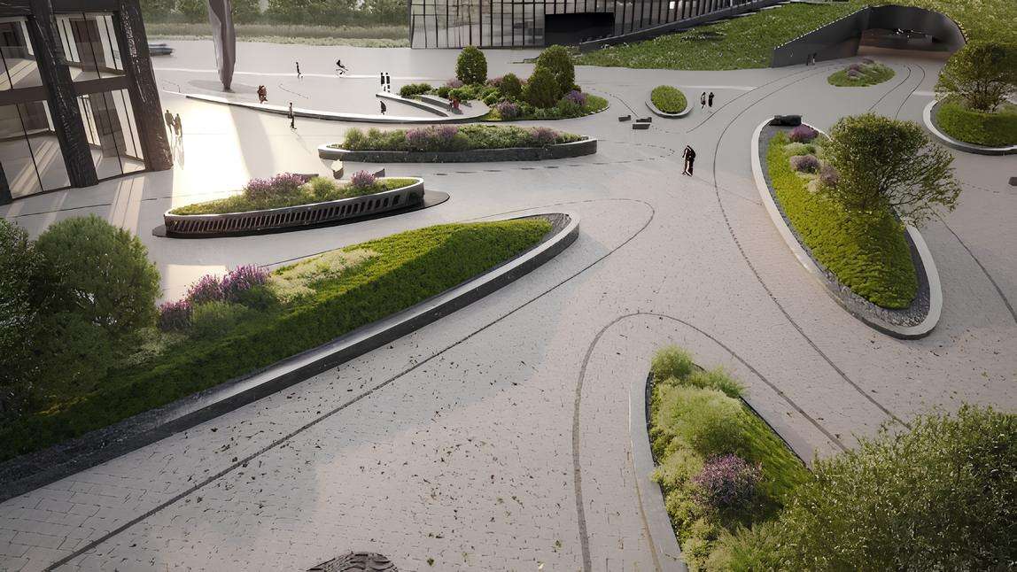 Пространство будет озеленено всесезонными растениями, включая горные сосны и лаванду, а для отдыха установлены скамейки из натурального камня. Эта территория плавно перетекает в общественный парк, предлагая резидентам возможность для прогулок, встреч на свежем воздухе или короткой перезагрузки в середине рабочего дня. Таким образом, двор — это не просто прилегающая площадь, а полноценная зона релаксации и вдохновения, интегрированная в деловой контекст.