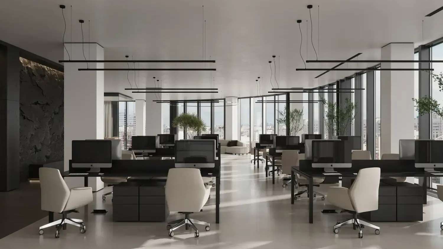Высота потолков от 3,3 метров и удобная модульная сетка колонн позволяют эффективно зонировать пространство. Панорамные окна открывают прекрасные виды и наполняют офисы естественным светом, что способствует повышению продуктивности команды.