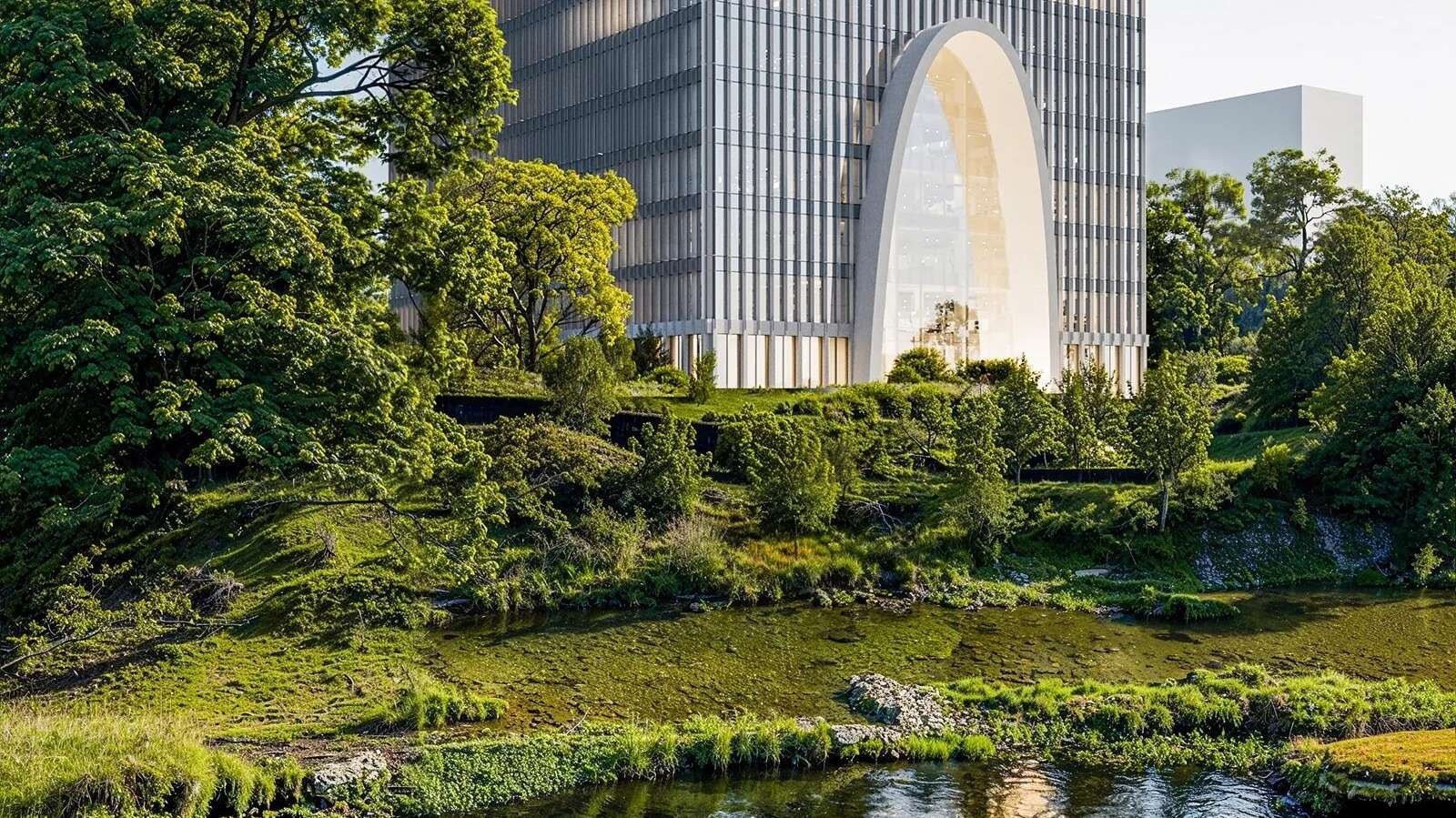 Автором архитектурной концепции выступило известное бюро Kleinewelt Architekten. Стиль проекта построен на ярком диалоге контрастов: легкая стеклянная призма фасада, обвитая тонкими металлическими ламелями, сочетается с монументальными бетонными арками, которые прорезают здание. Эти арки служат визуальными «воротами» к реке, символически соединяя урбанистическую архитектуру с природой.