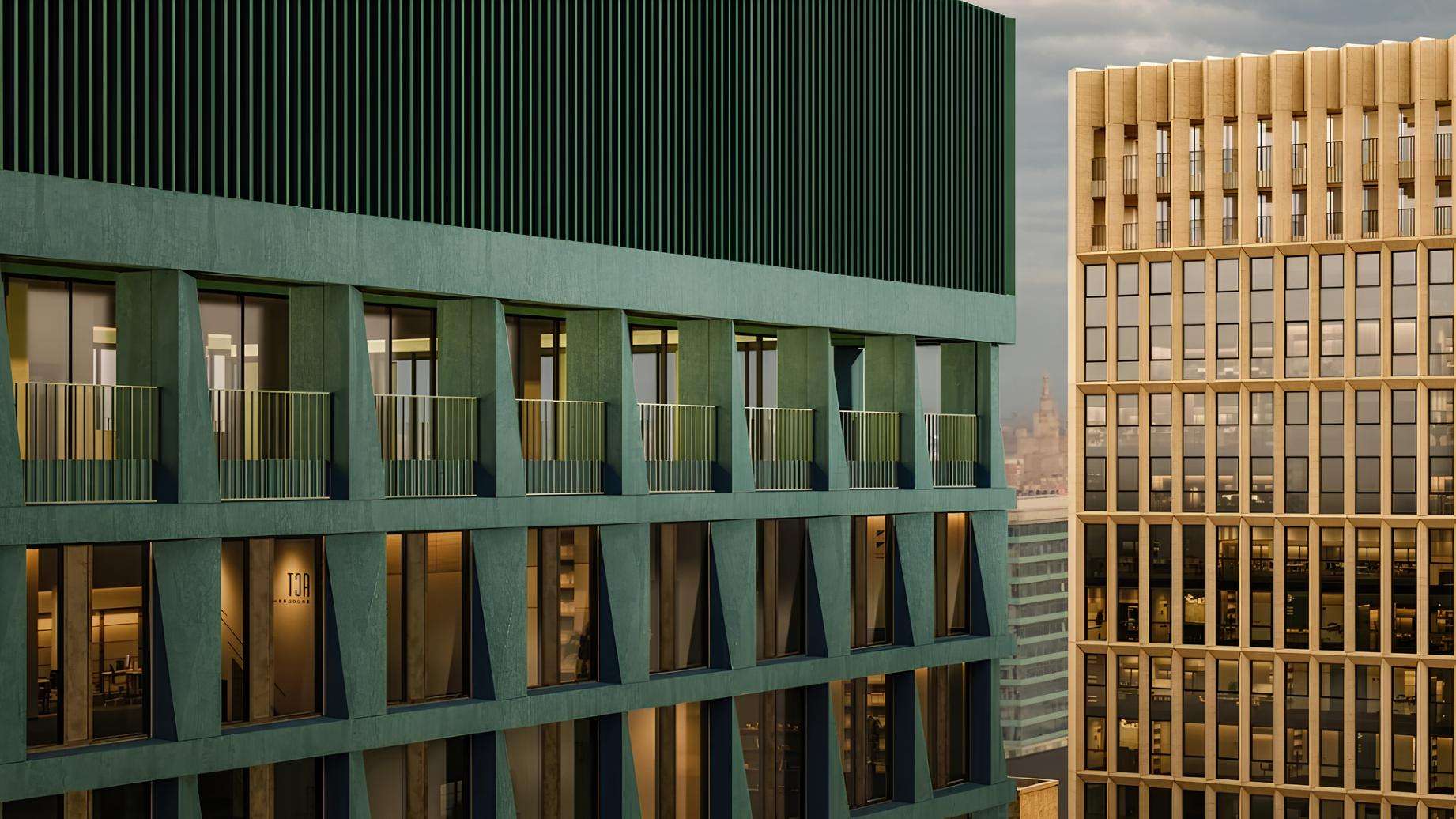 Каждое здание имеет индивидуальный фасад, выполненный из инновационного материала — стеклофибробетона, известного своей прочностью, пластичностью и долговечностью. Фасады отличаются сложным объемным рисунком, который создает выразительную игру света и тени в течение всего дня. Для создания открытого и светлого пространства архитекторы применили панорамное остекление от пола до потолка, обеспечивающее максимальный доступ естественного света в каждый офис.