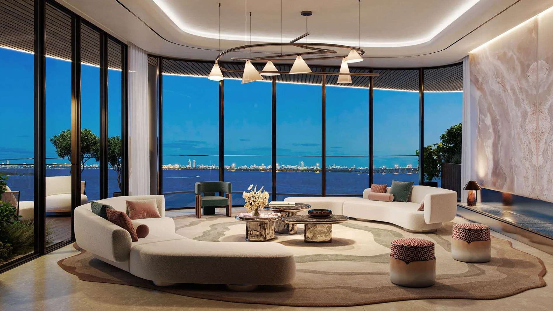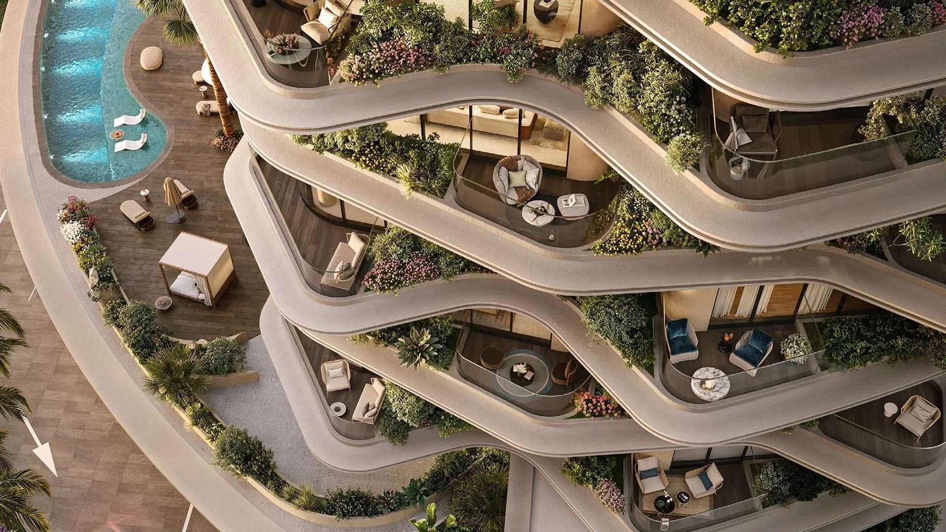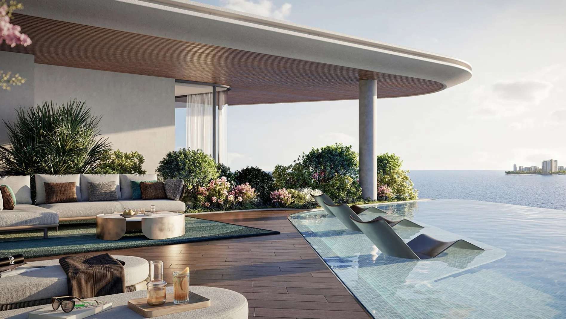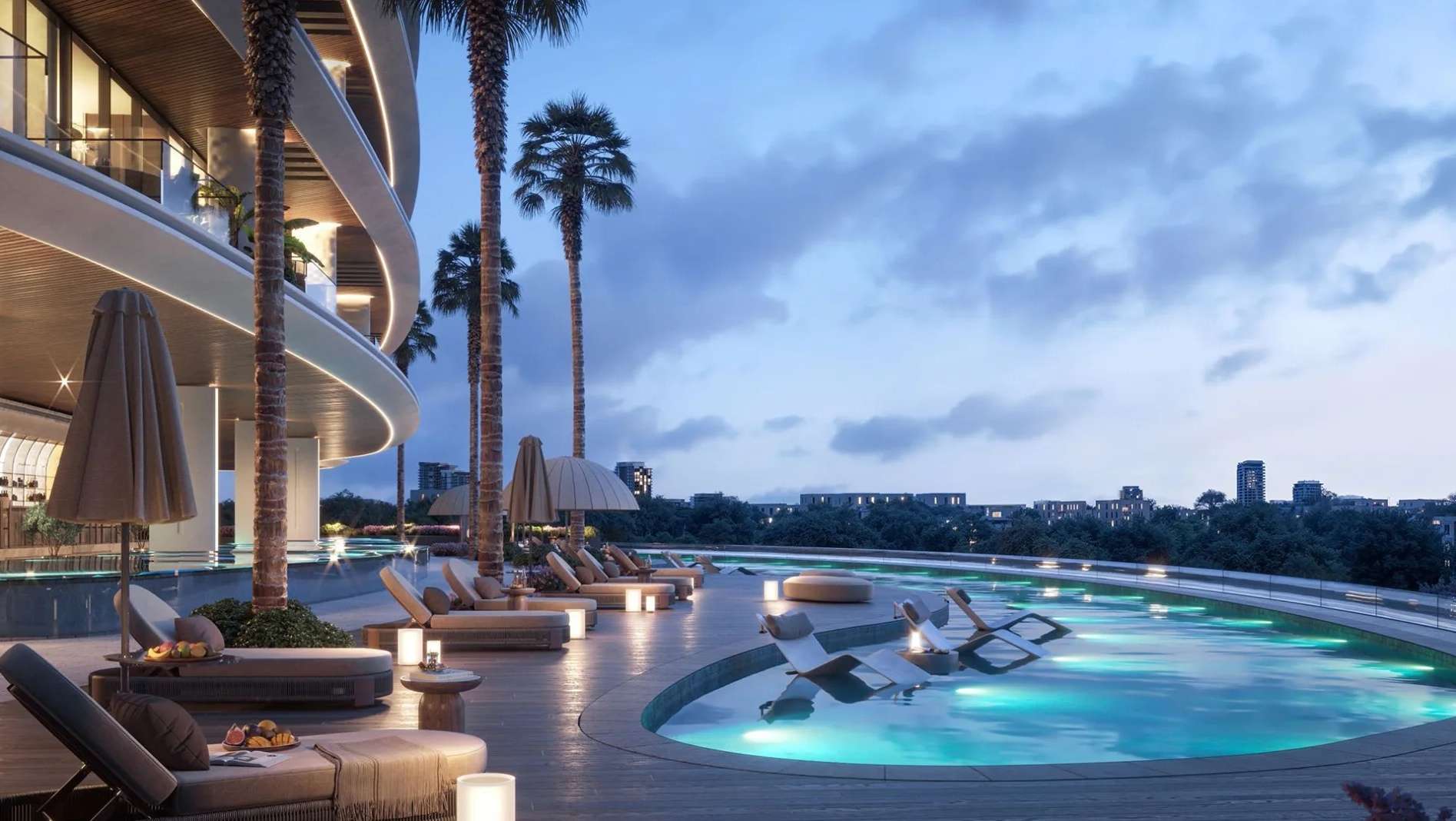 В пентхаусах предусмотрены приватные бассейны, высокие потолки и отделка из премиальных материалов, подчеркивающих статус владельца.