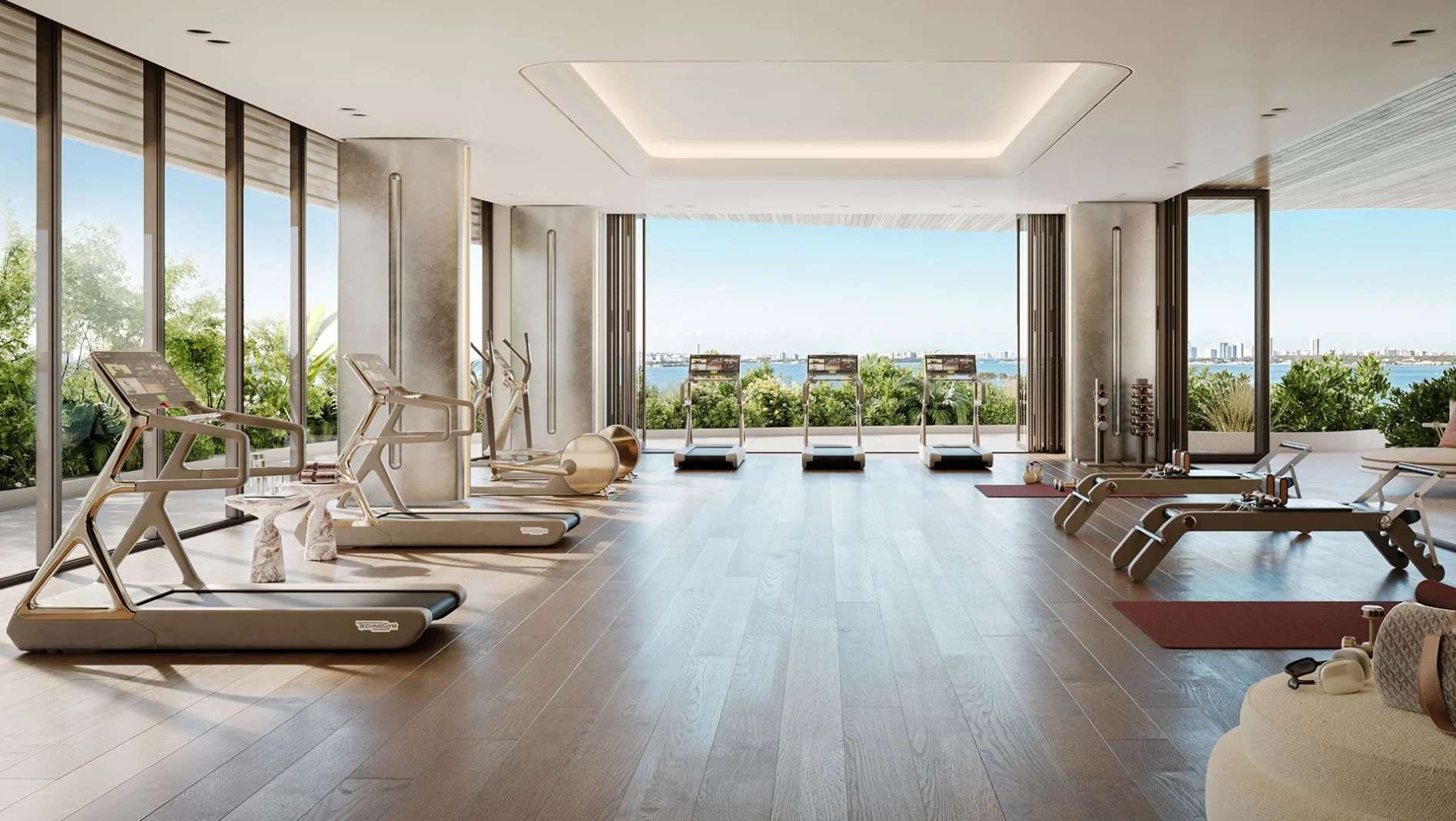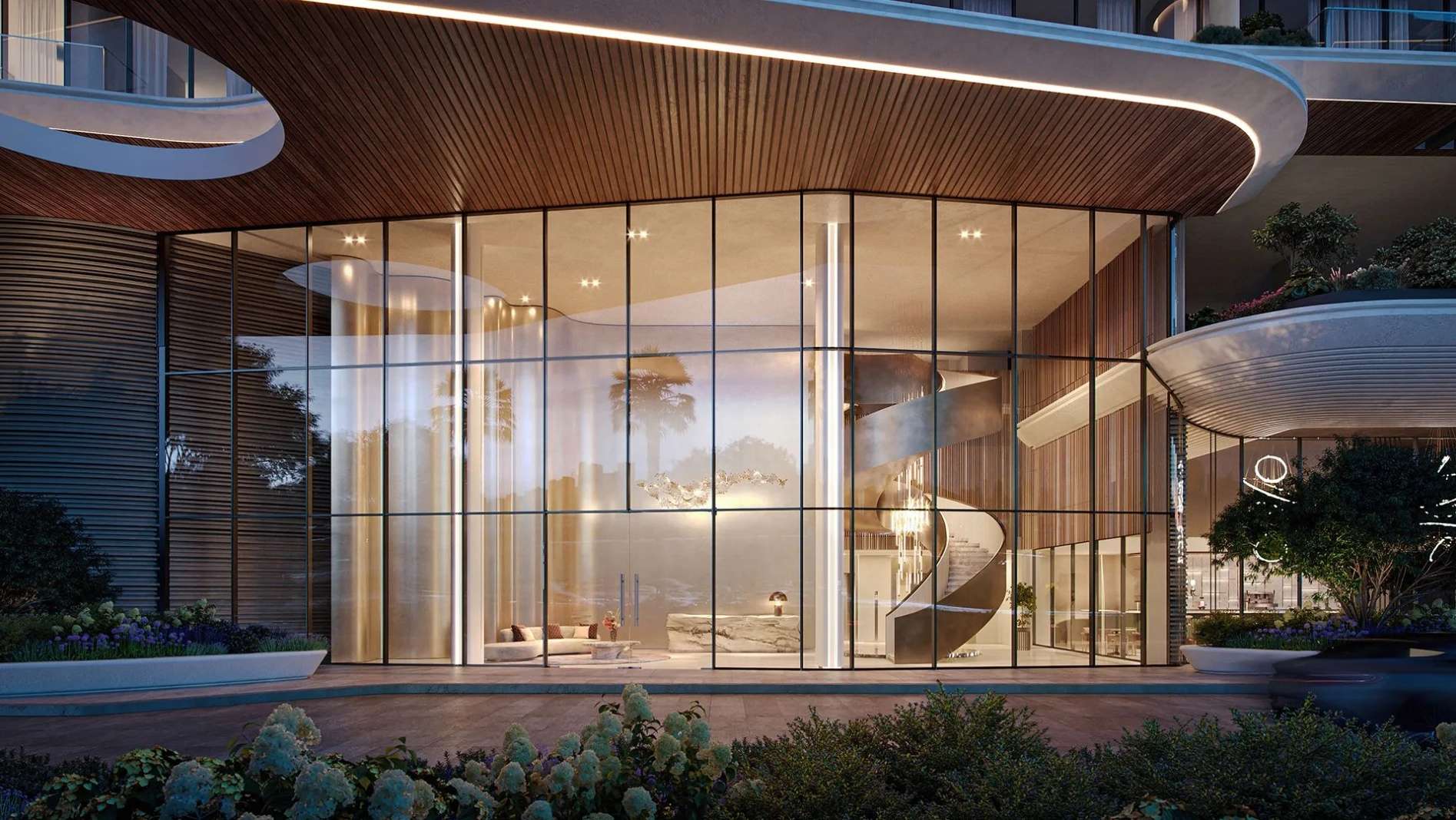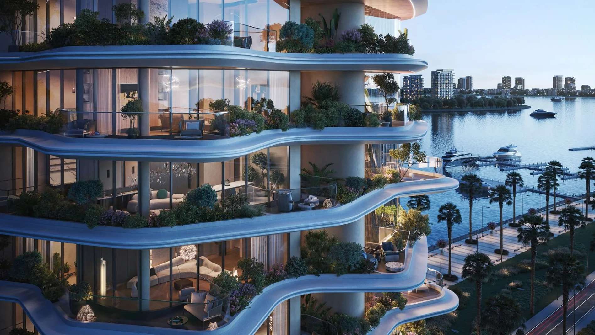 В пентхаусах предусмотрены приватные бассейны, высокие потолки и отделка из премиальных материалов, подчеркивающих статус владельца.