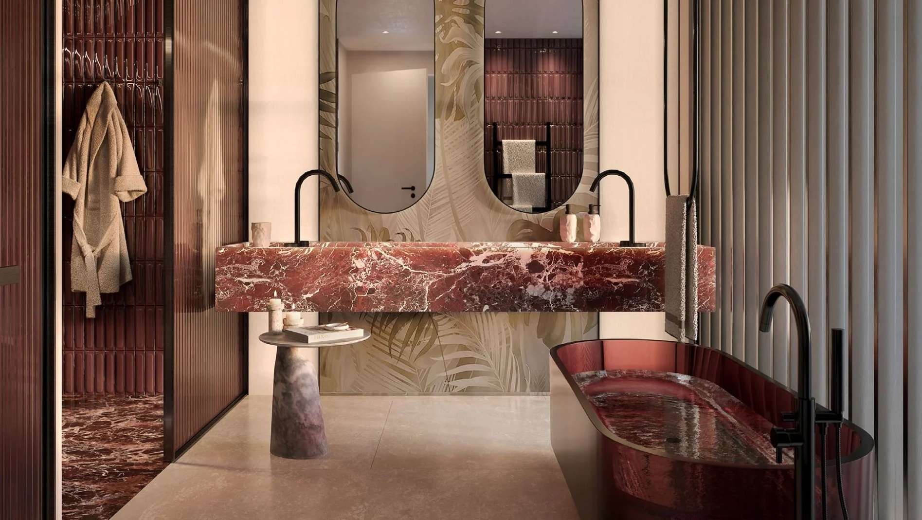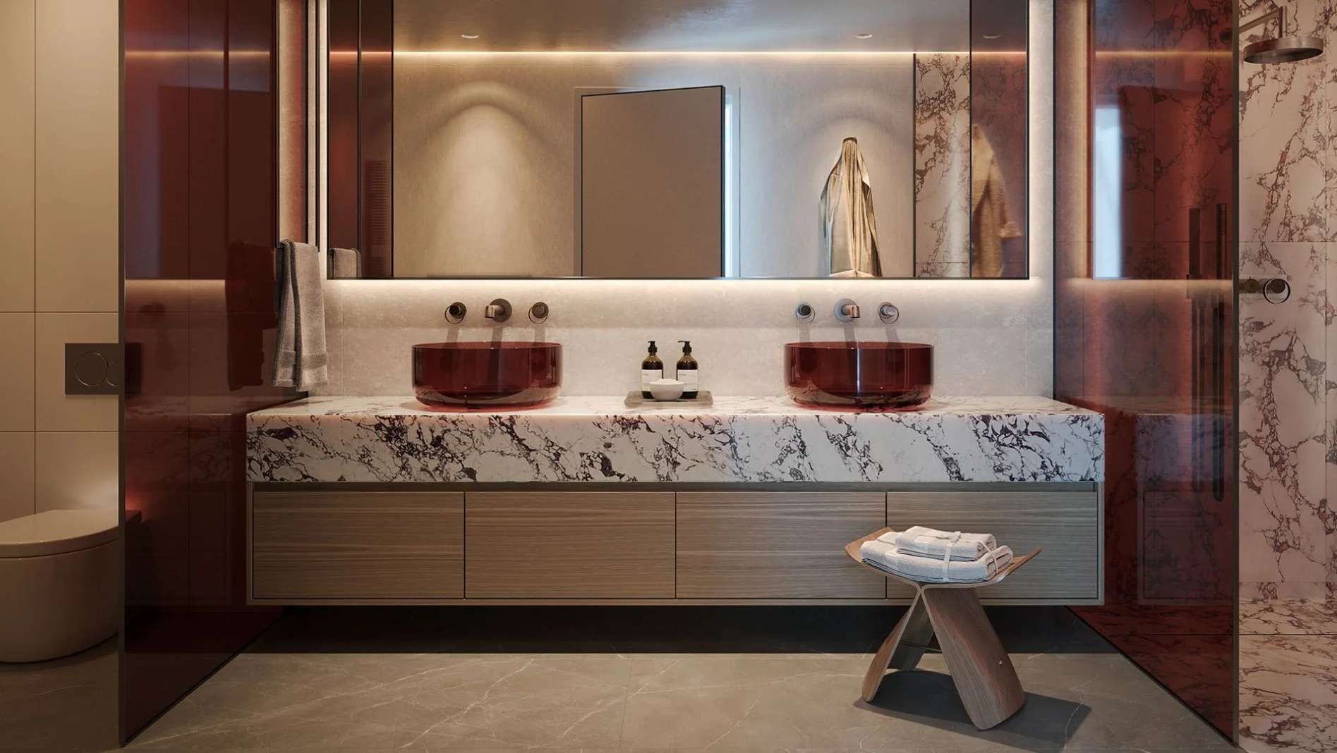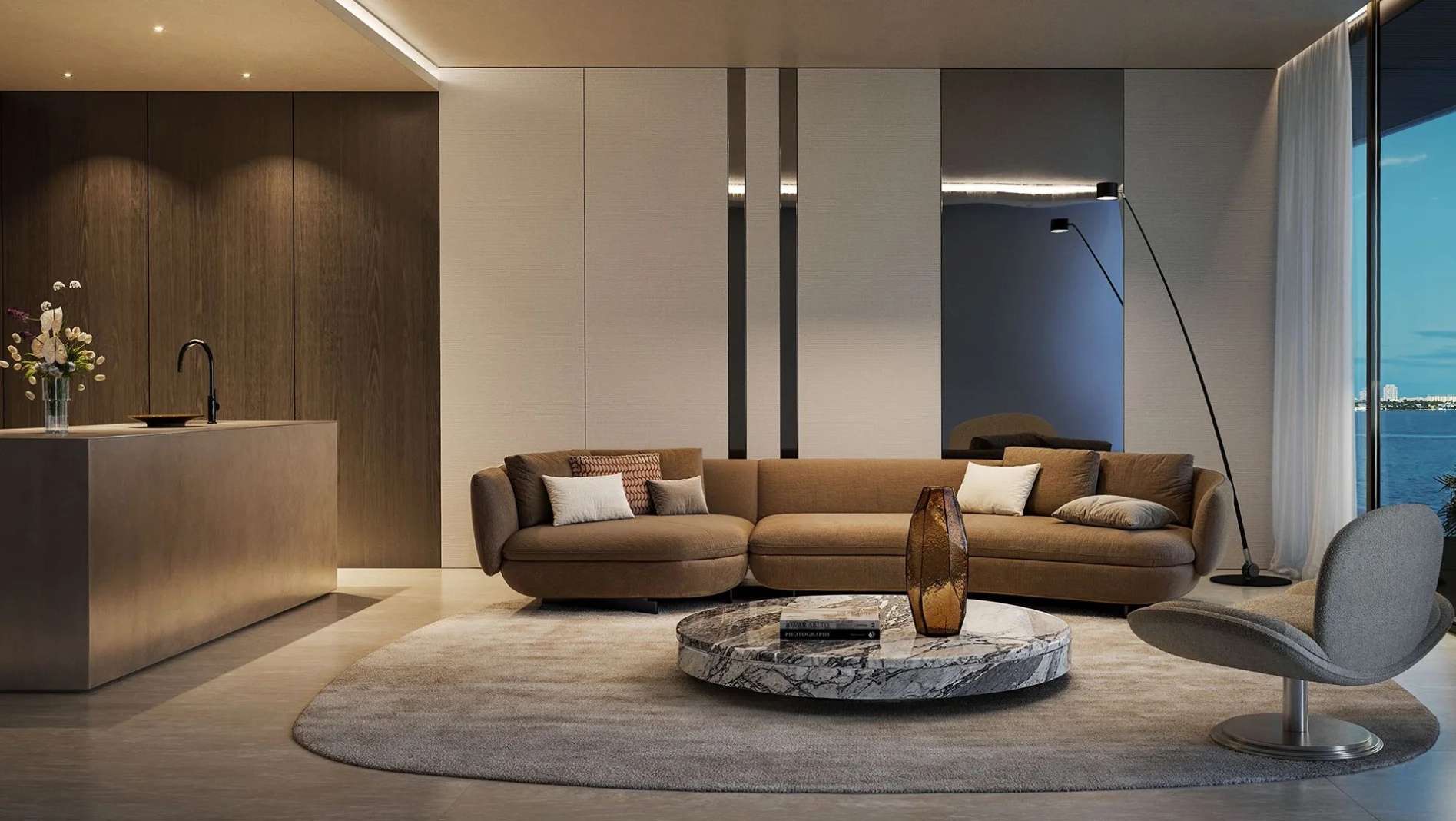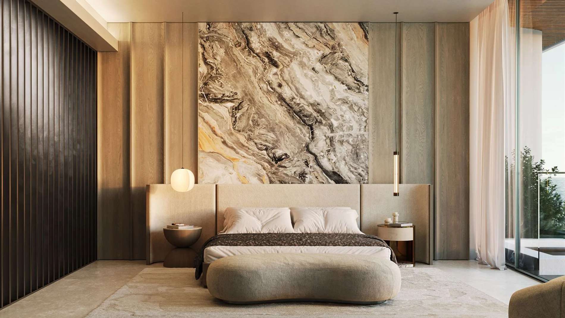В пентхаусах предусмотрены приватные бассейны, высокие потолки и отделка из премиальных материалов, подчеркивающих статус владельца.