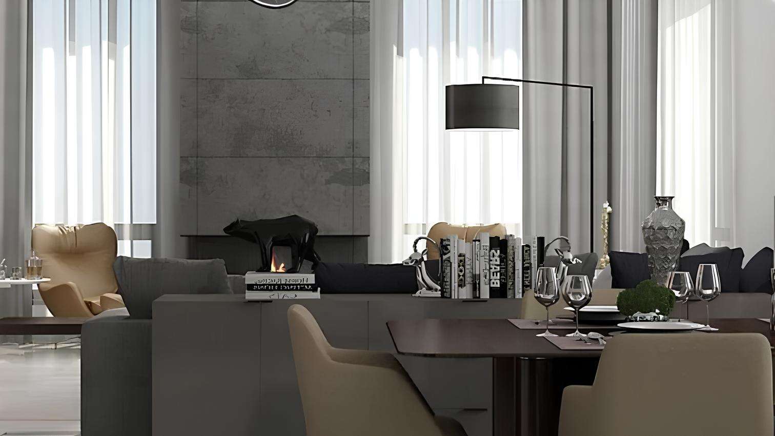 Продумана не только внешняя эстетика, но и внутреннее наполнение: свет в домах играет главную роль, чему способствуют панорамное остекление и грамотно спланированные интерьеры с тщательно подобранной цветовой гаммой. Пространство интерьера плавно перетекает в ландшафт участка, размывая границы между домом и садом.