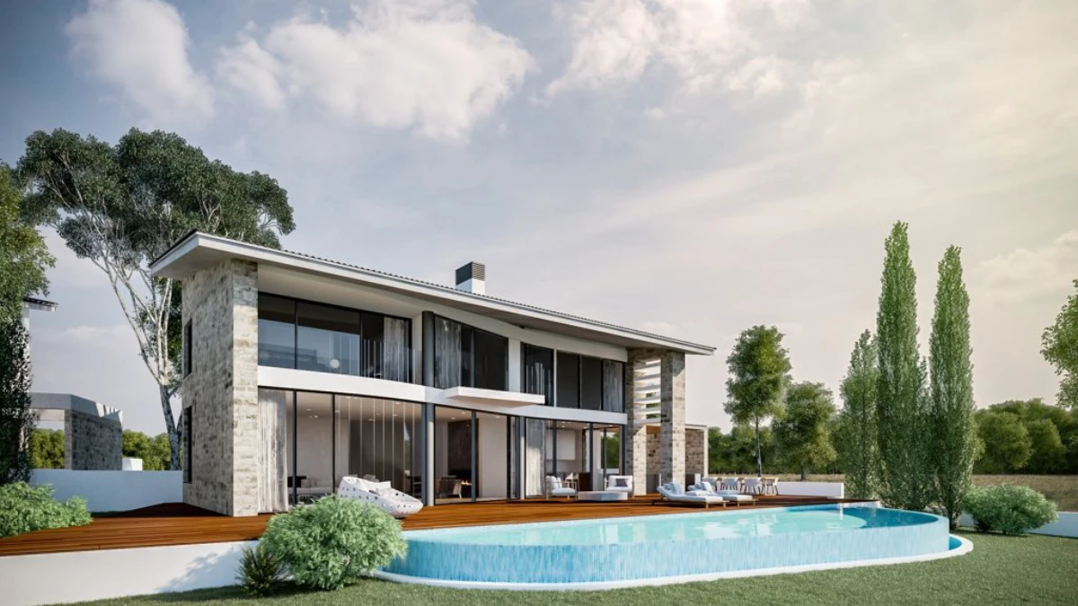 Дизайн сочетает современные линии с традиционными кипрскими элементами – натуральный камень, тёплые оттенки дерева и терракотовая черепица создают атмосферу уюта и изысканности.
