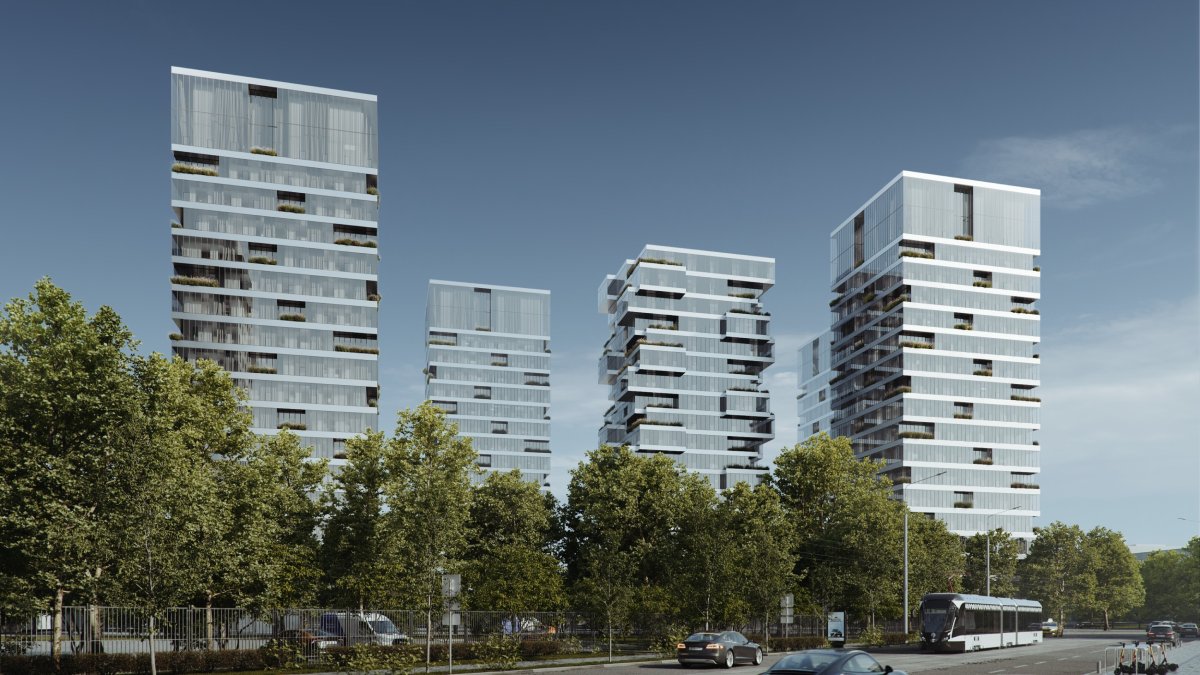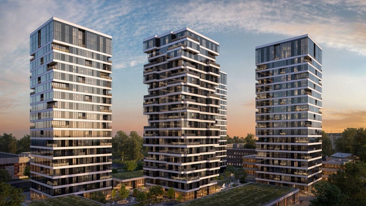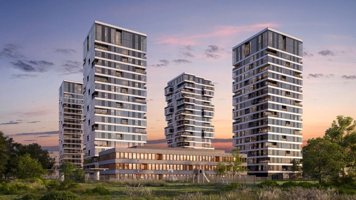 Пять башен с панорамными окнами и приватными террасами выстроены вокруг зелёного двора парка, а на первых этажах устроена полная коммерческая инфраструктура.