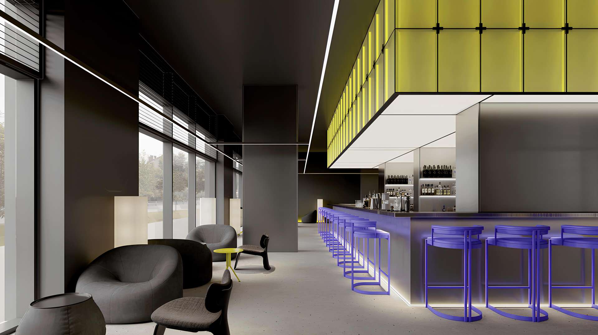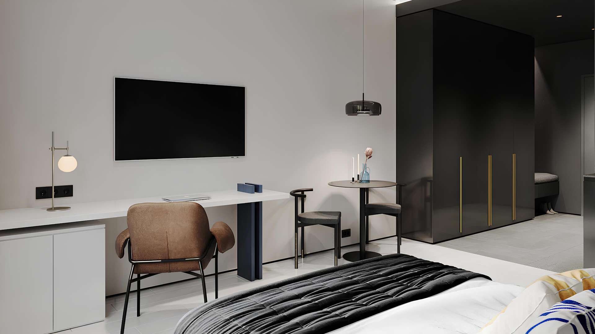 Центральным элементом лобби апарт-отеля станет впечатляющий зеркальный биокамин, создающий атмосферу уюта и роскоши. Дизайнеры использовали монохромную гамму в оттенках серого и черного, разбавленную яркими акцентами желтого и фиолетового цветов в мебели и освещении.