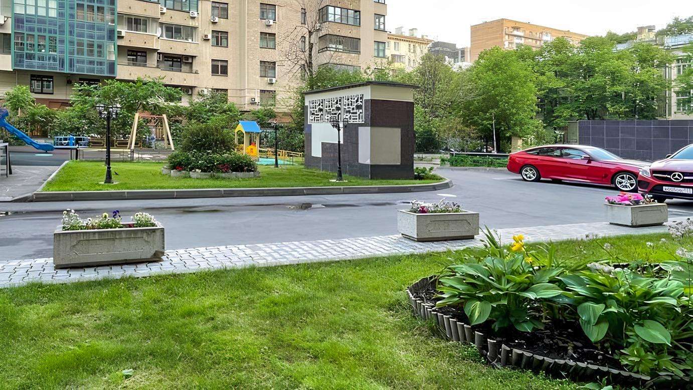 Территория жилого комплекса является закрытой и благоустроенной для приватного отдыха. Внутренний двор разделен на функциональные зоны, среди которых есть площадки для игр и спокойного времяпровождения.