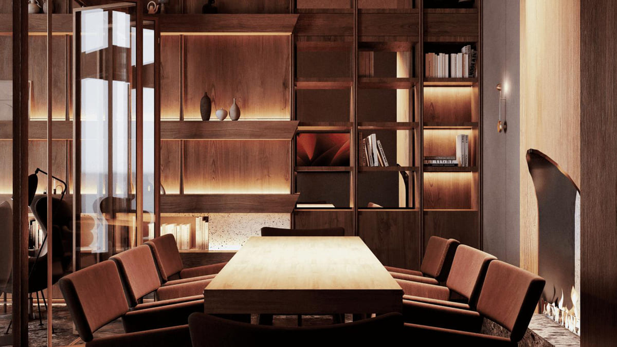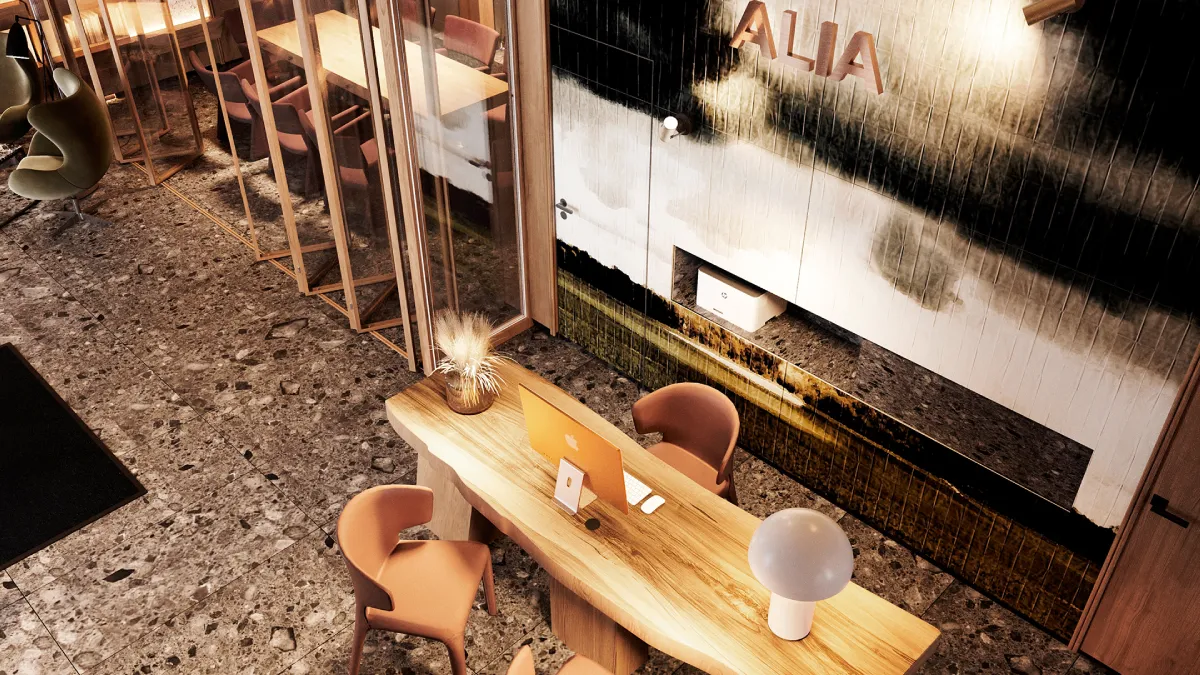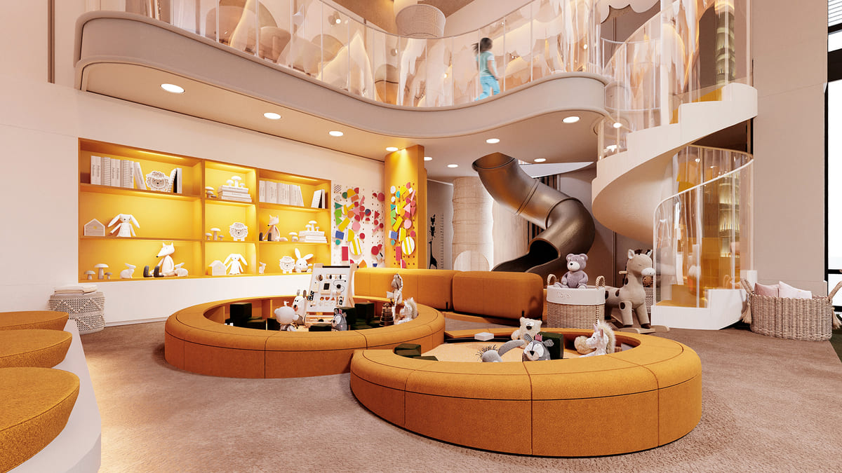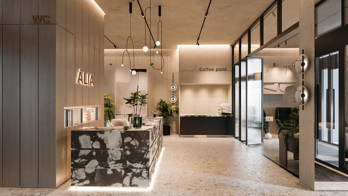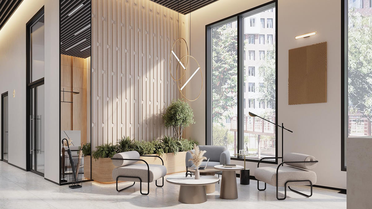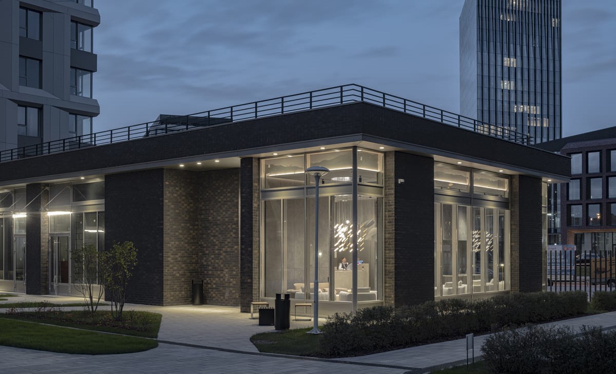 Здесь – высокие потолки, панорамные окна, камин, натуральные материалы и светлая эстетика. Функциональное наполнение включает зоны для ожидания и отдыха, переговорные комнаты, детское пространство – всё, что делает первый контакт с домом продолжением домашнего уюта.