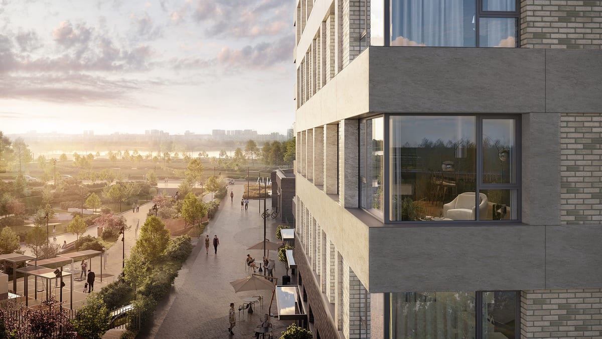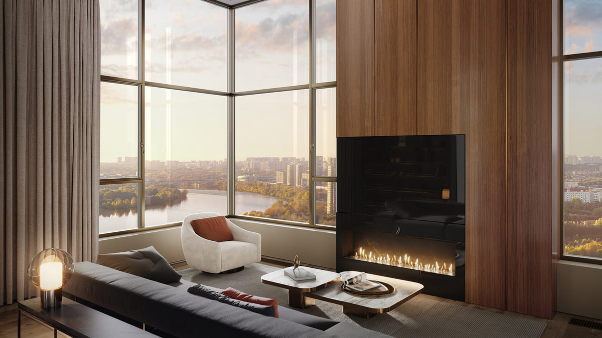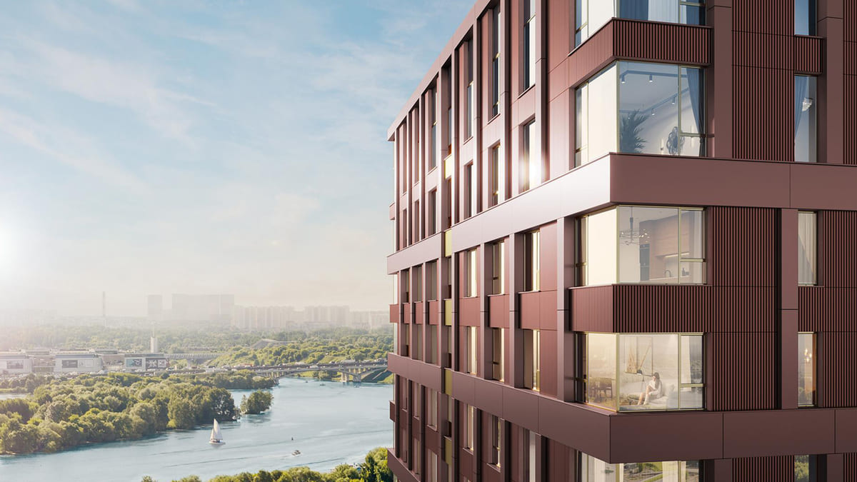 Панорамное остекление обеспечивает естественный свет и открывает живописные виды на реку, парки и город.