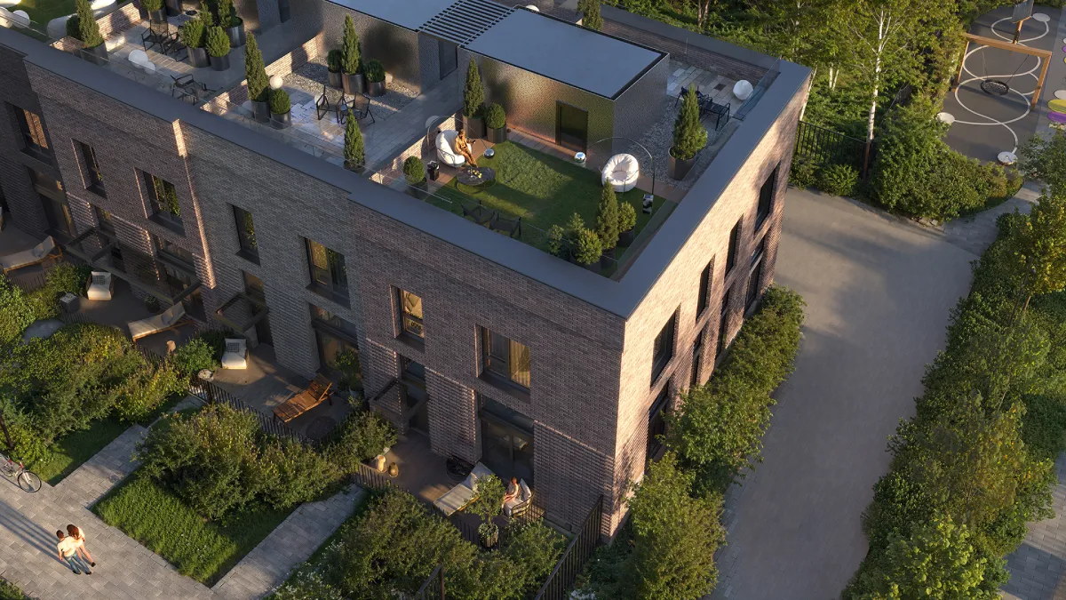 Фасады домов выполнены из натуральных экологичных материалов, а цветовые решения и текстуры подчёркивают сдержанную элегантность комплекса.