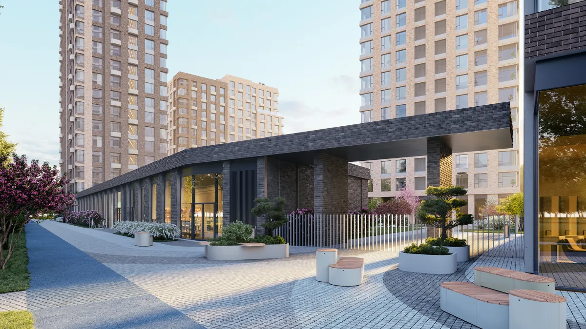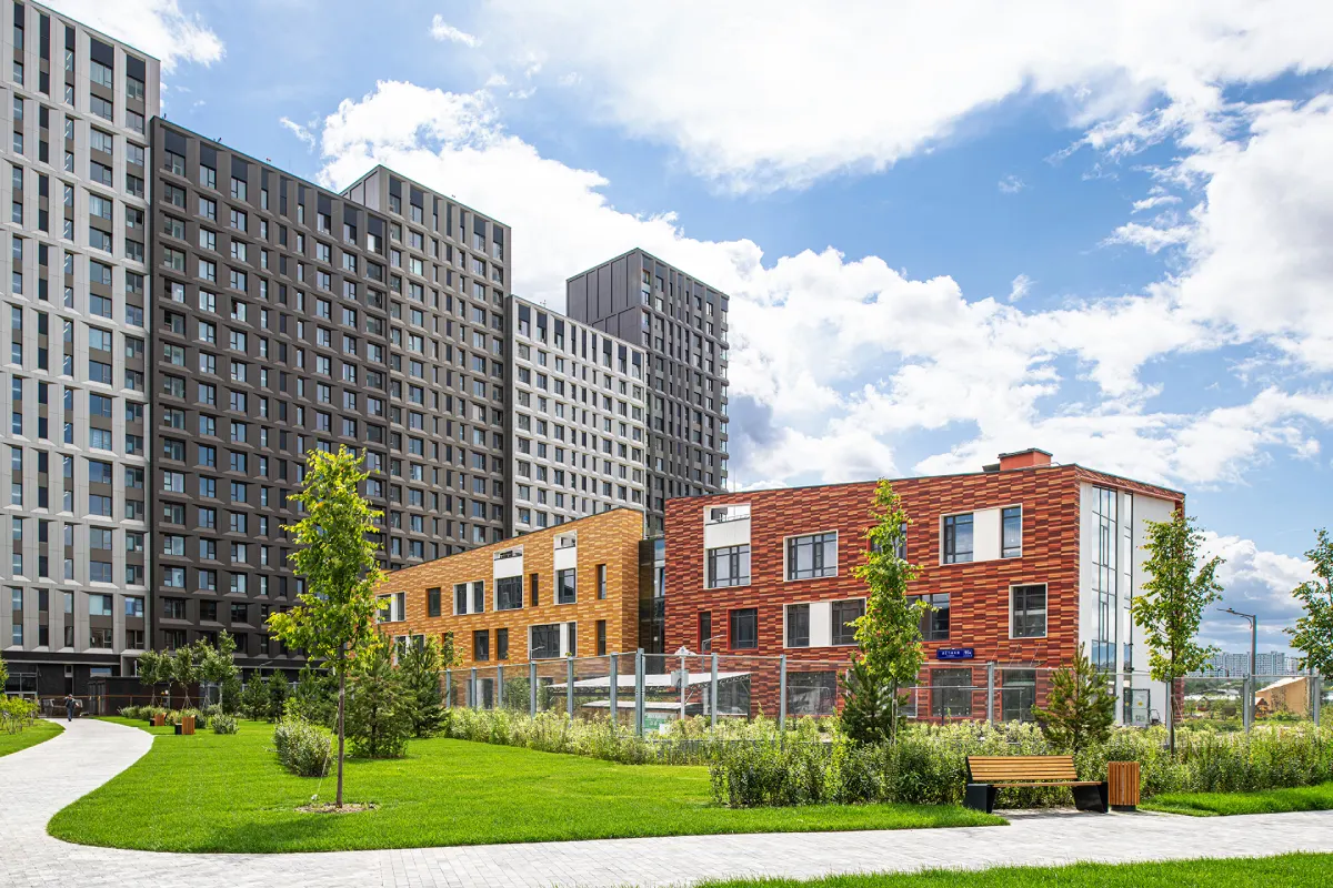 Разноэтажная застройка позволяет сохранить ощущение воздуха и простора. Между корпусами – открытые дворы, пропускающие свет и обеспечивающие приватность. Архитекторы сознательно отказались от плотной структуры – район воспринимается как зелёный жилой массив с широкими перспективами и свободным дыханием.