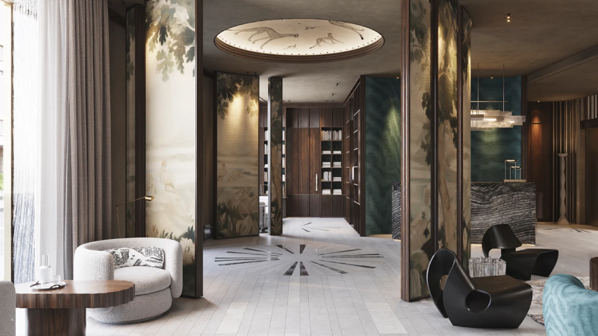 Лобби Annabel’s – это пространство, где с первых шагов ощущается атмосфера дома. Его концепция построена на эклектике: классические элементы сочетаются с современными, а натуральные материалы соседствуют с рукотворными. Здесь дерево и мрамор создают основу, латунные акценты добавляют благородного блеска, а гобелены и камин наполняют интерьер теплом и аристократичностью.