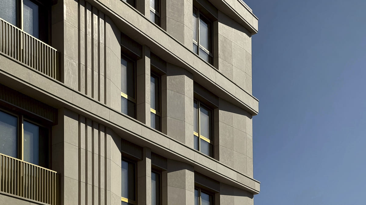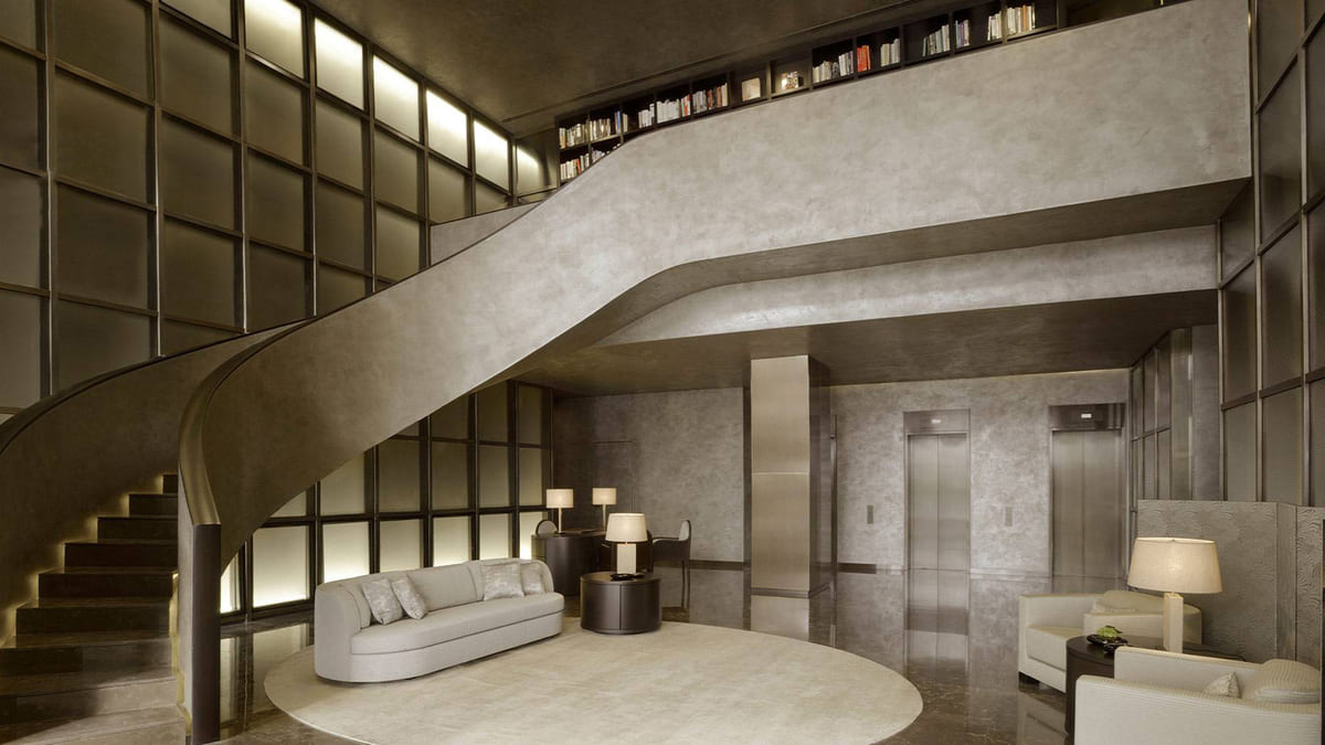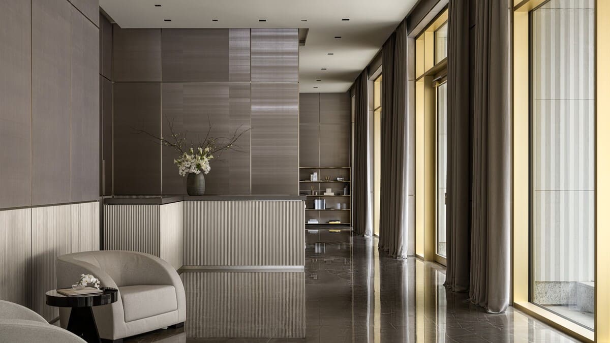 Пространства входных групп оформлены по дизайн-проекту от Armani/Casa Interior Design Studio. Интерьер сочетает чёткую геометрию, премиальные материалы, тёплые текстуры и благородную цветовую палитру.