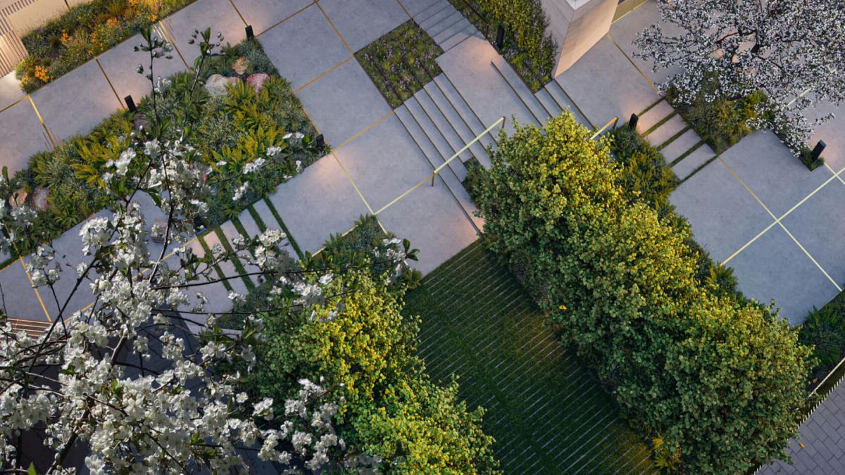 Приватная территория комплекса оформлена по авторскому проекту ландшафтного бюро Gillespies. Пространство оформлено так, чтобы выглядеть эффектно круглый год.