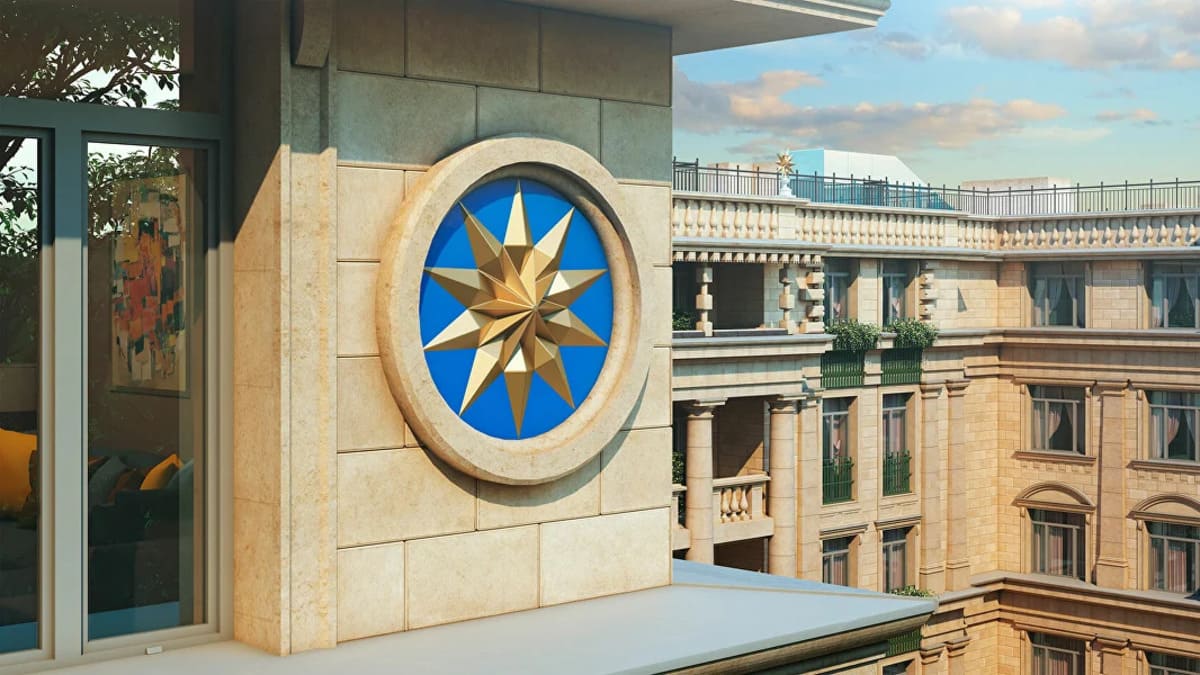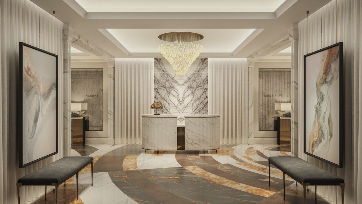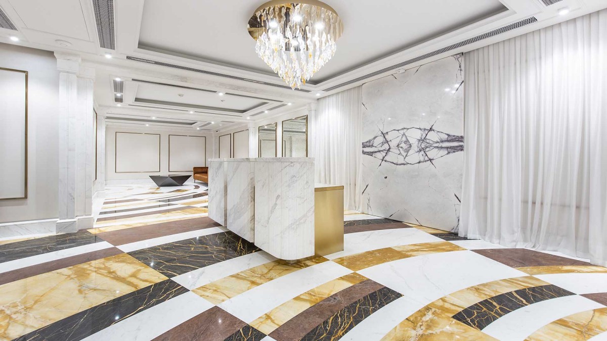Входная зона Astris – это визитная карточка дома и первое впечатление, которое остаётся надолго. Холл оформлен мраморной мозаикой с радиальным орнаментом, отсылающим к схеме улиц Москвы.