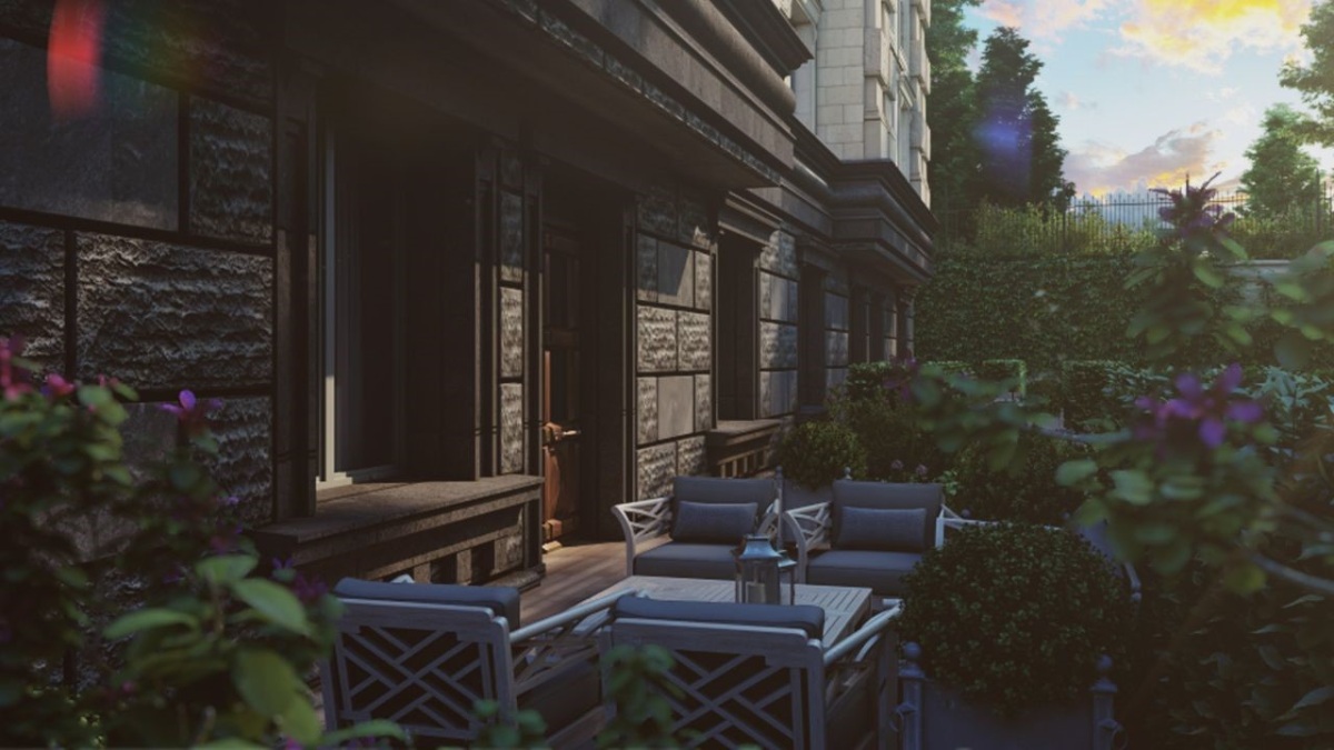 Ландшафтное оформление выполнено в классическом стиле: геометрически выверенные формы, композиционно расставленные зелёные акценты, элегантный фонтан в центре, а также приватные зоны отдыха с удобными скамейками и мягким освещением.