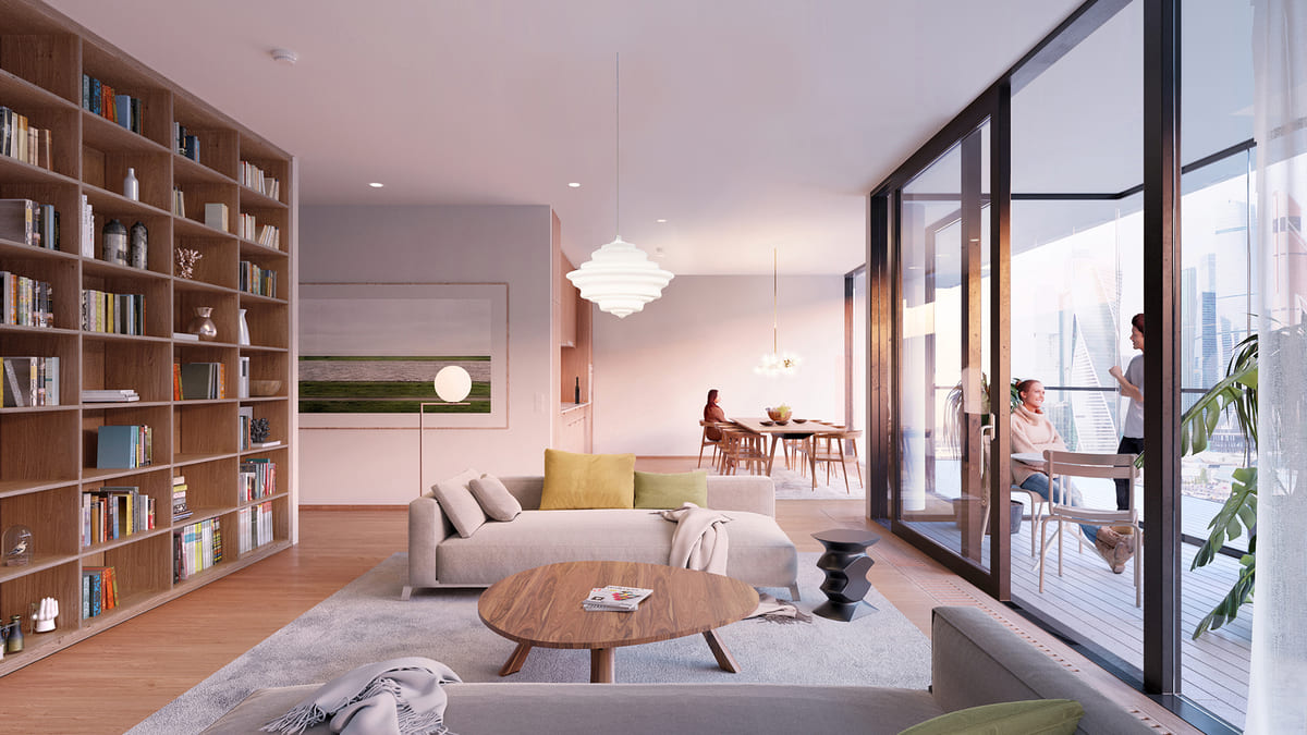 Площади – от 57 до 245 м². Все квартиры – с панорамным остеклением, лоджиями или террасами, многие – с верандами и видами на Москву-реку.