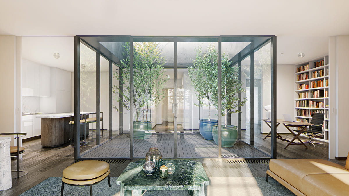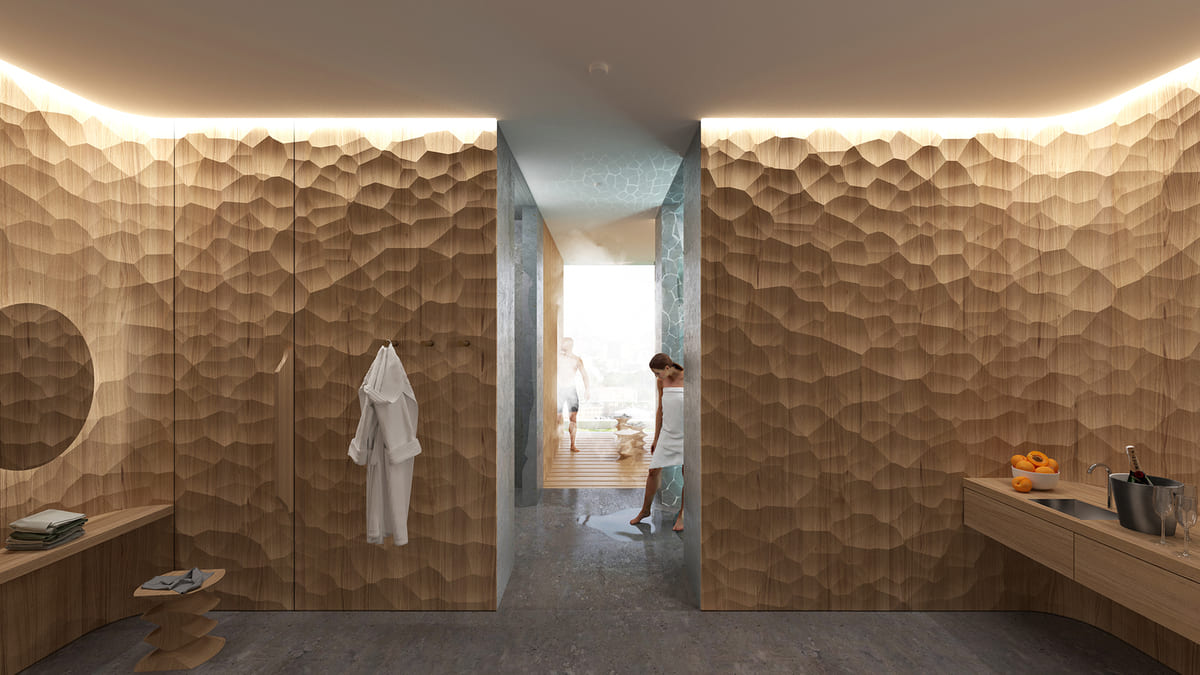 На верхних уровнях – sky villas: 7 особняков площадью от 837 до 974 м² с террасами, собственными саунами, каминами и возможностью обустроить приватный внутренний двор.