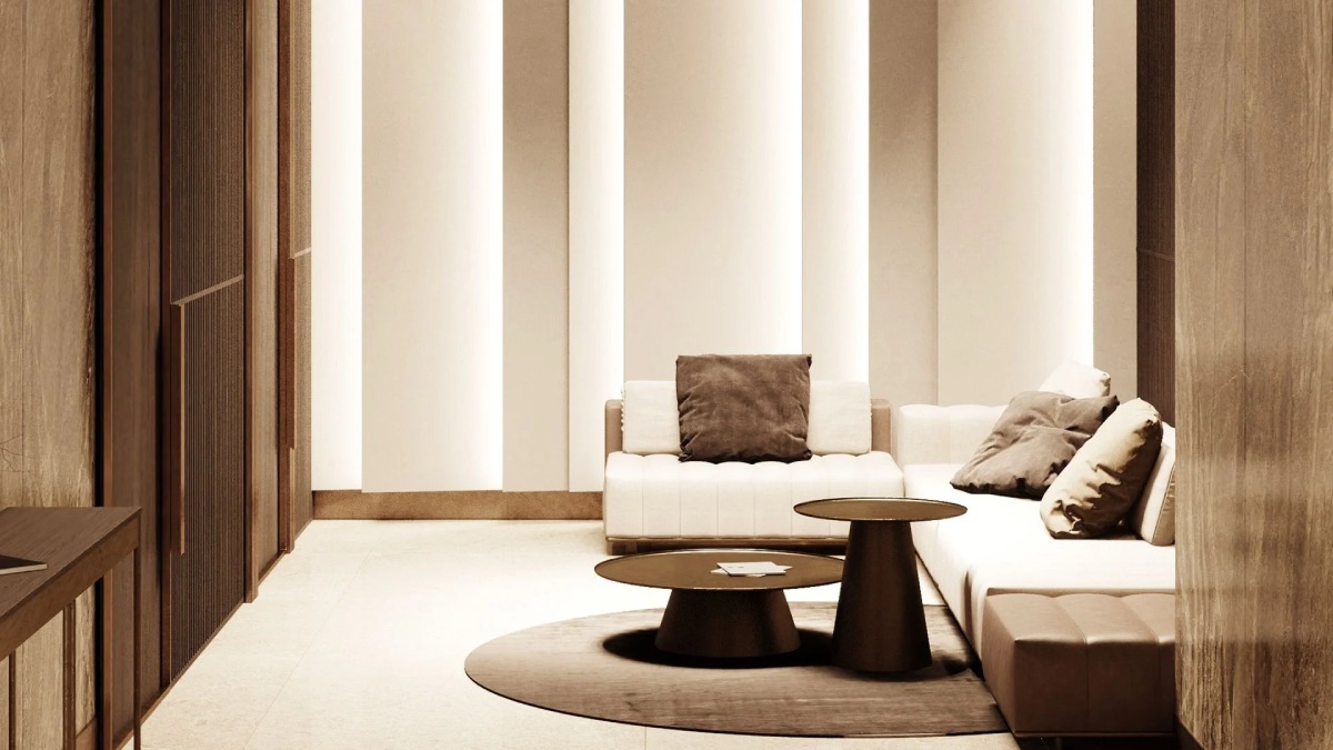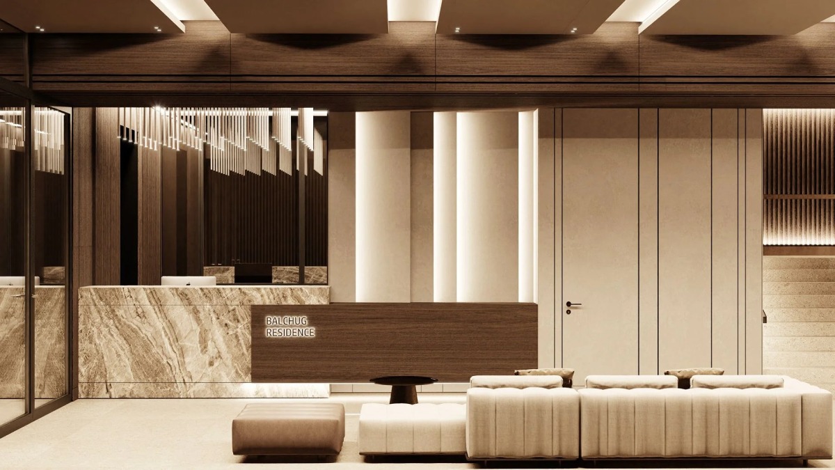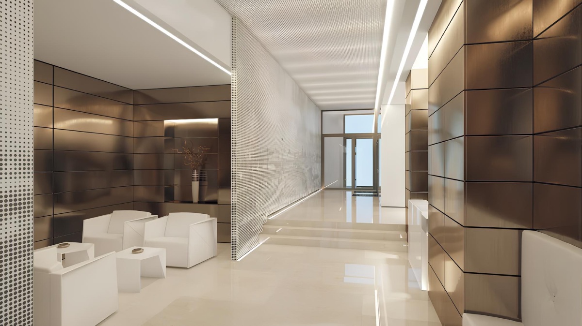 Лобби оформлены с использованием премиальных материалов и оснащены стойкой ресепшена, а также уютными lounge-зонами с мягкой мебелью, что подчеркивает камерность и статус проекта.