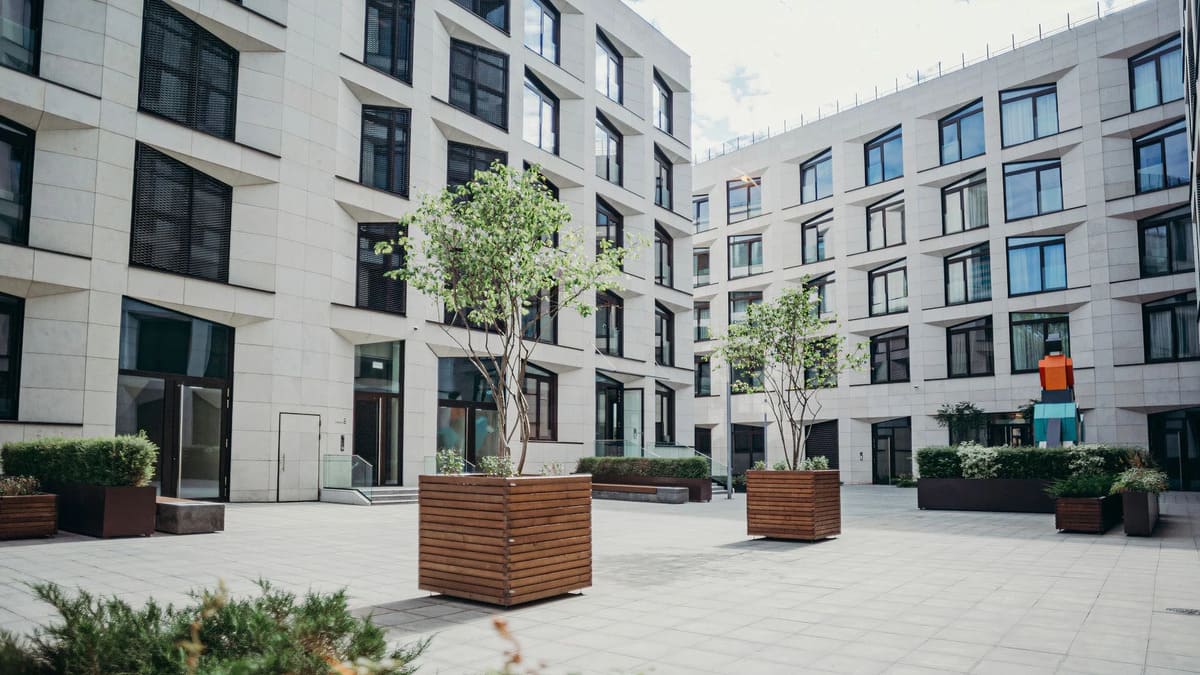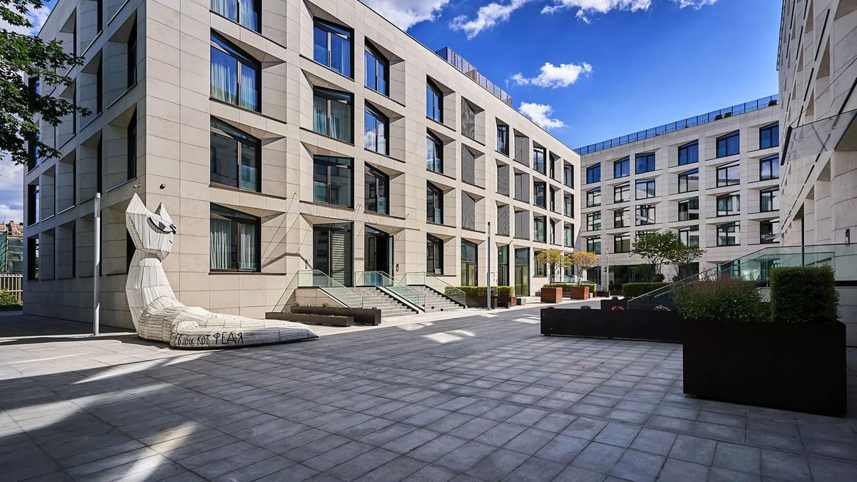 Внутренняя территория Balchug Residence оформлена в концепции современного городского двора с акцентом на эстетику и приватность.