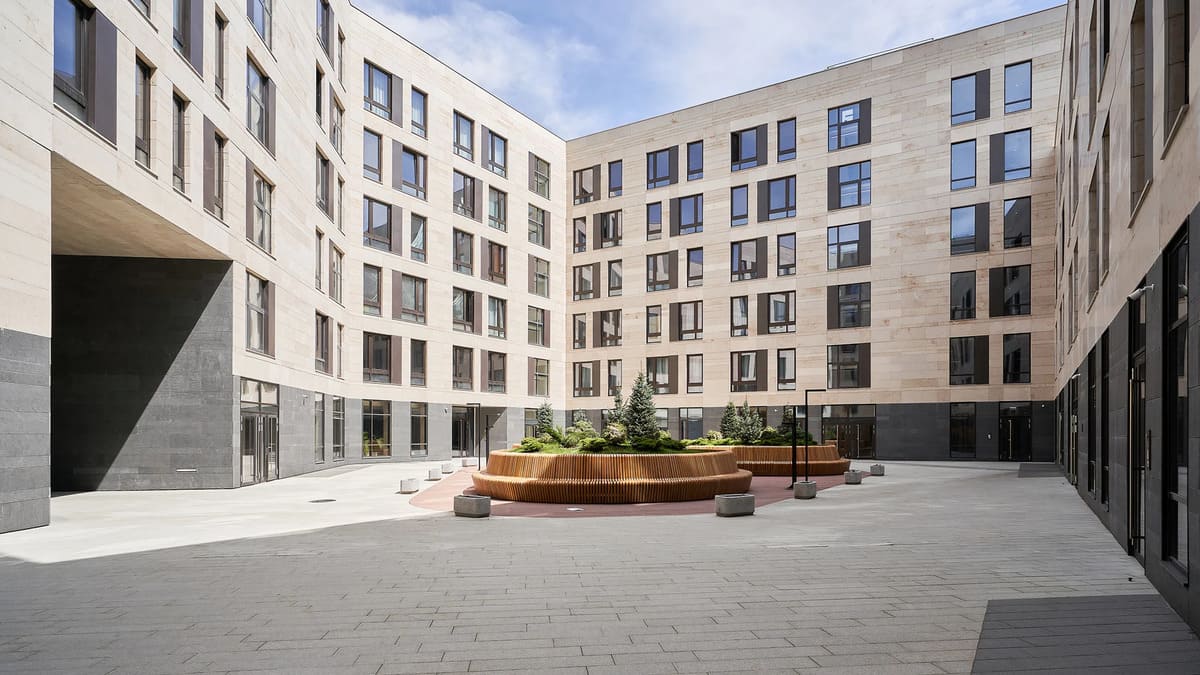 Архитектура комплекса не только подчёркивает статус локации, но и формирует уютное закрытое пространство для жителей: внутренний двор-сад с зонами отдыха создаёт атмосферу камерности и приватности.
