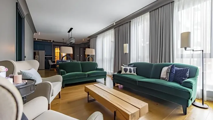 В лобби организованы уютные зоны для ожидания, а продуманное освещение подчеркивает архитектурные особенности интерьеров, делая общественные пространства еще более гостеприимными в вечернее время.