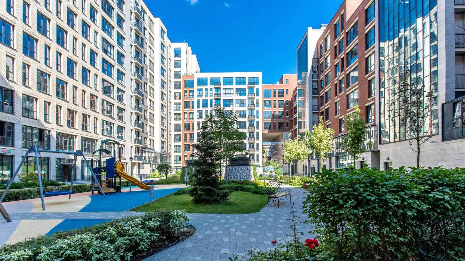 Концепция «двор без машин» и обилие зелени делают это пространство идеальным местом для ежедневного отдыха и восстановления сил после городской суеты.