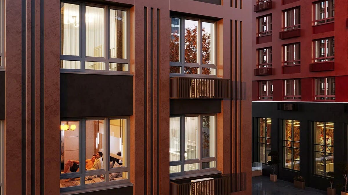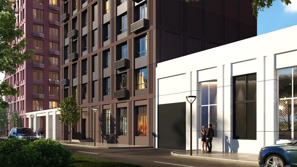 Пространство квартала занимает 1,6 га, что позволило объединить жилые корпуса, благоустроенные дворы и подземный паркинг в единую гармоничную среду.