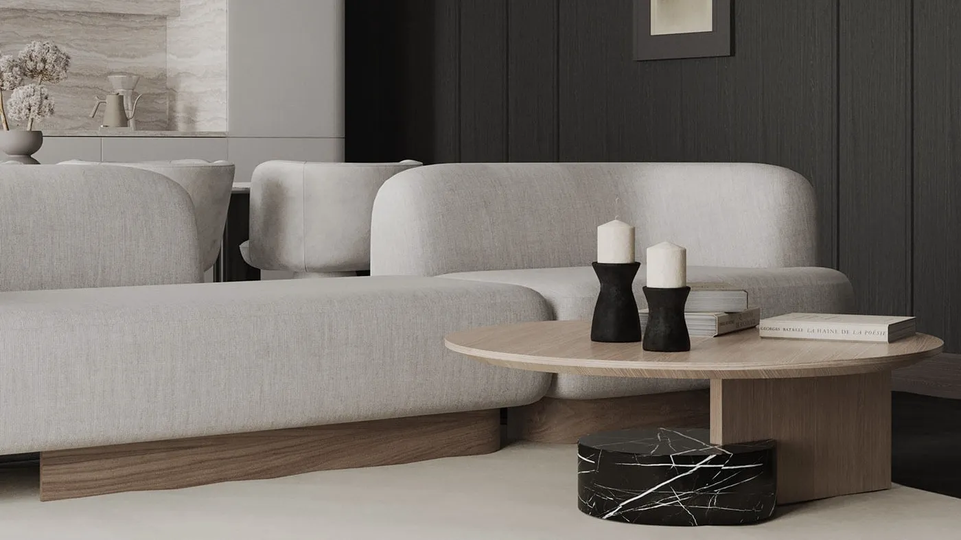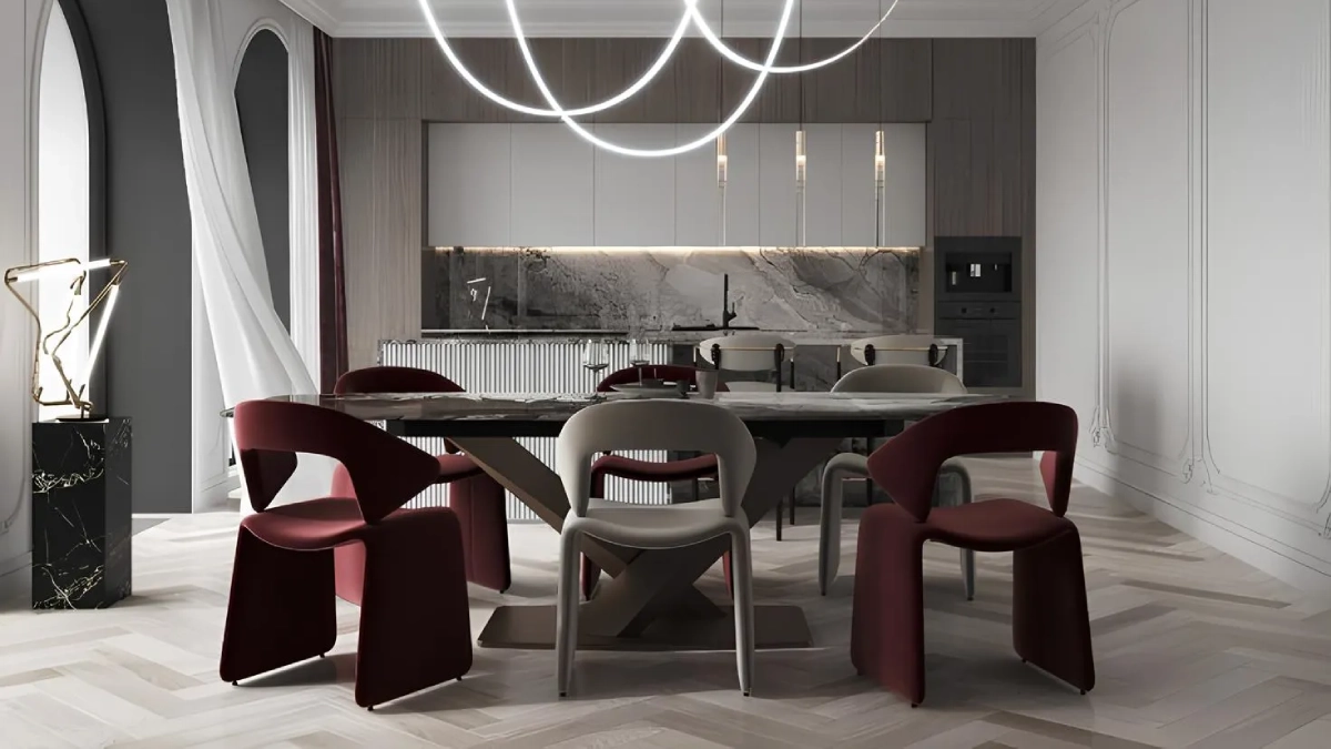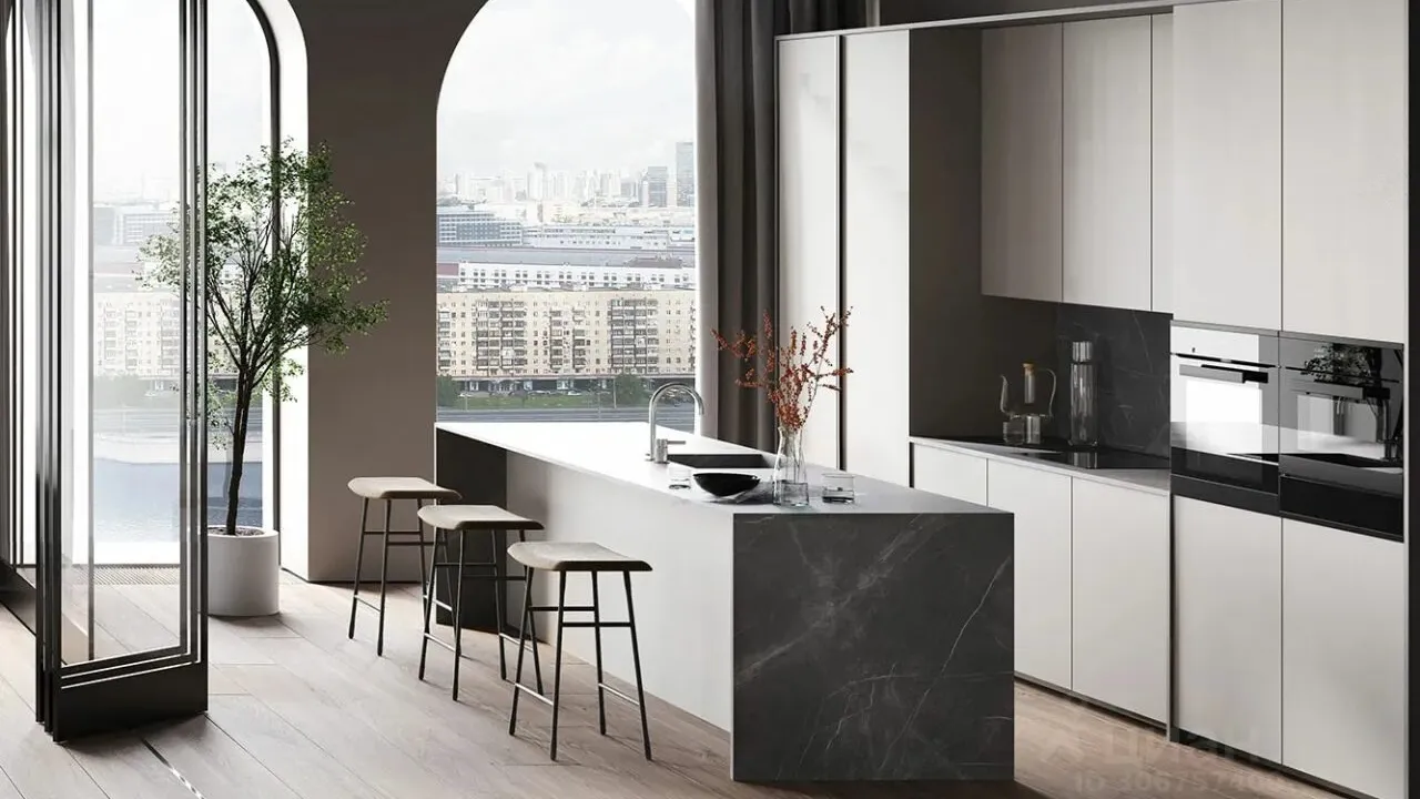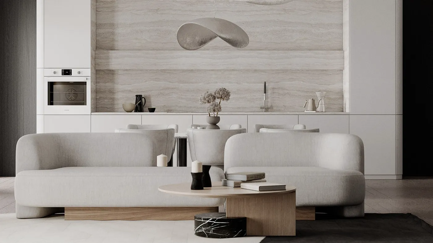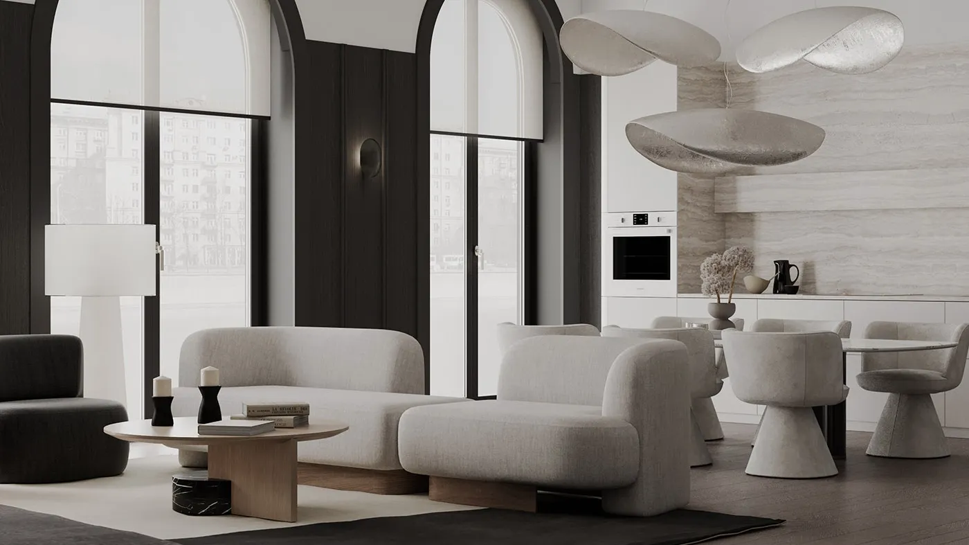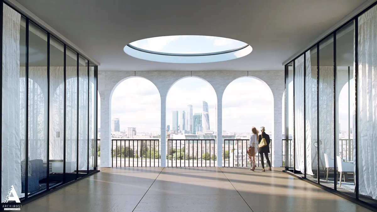 Панорамные арки высотой в два этажа обеспечивают прекрасное естественное освещение, позволяя солнечному свету заливать жилые пространства в течение всего дня.