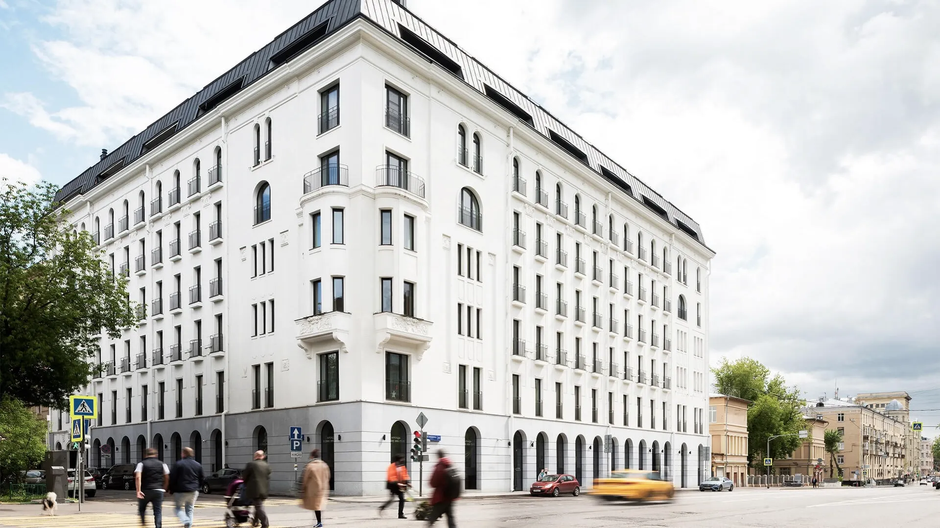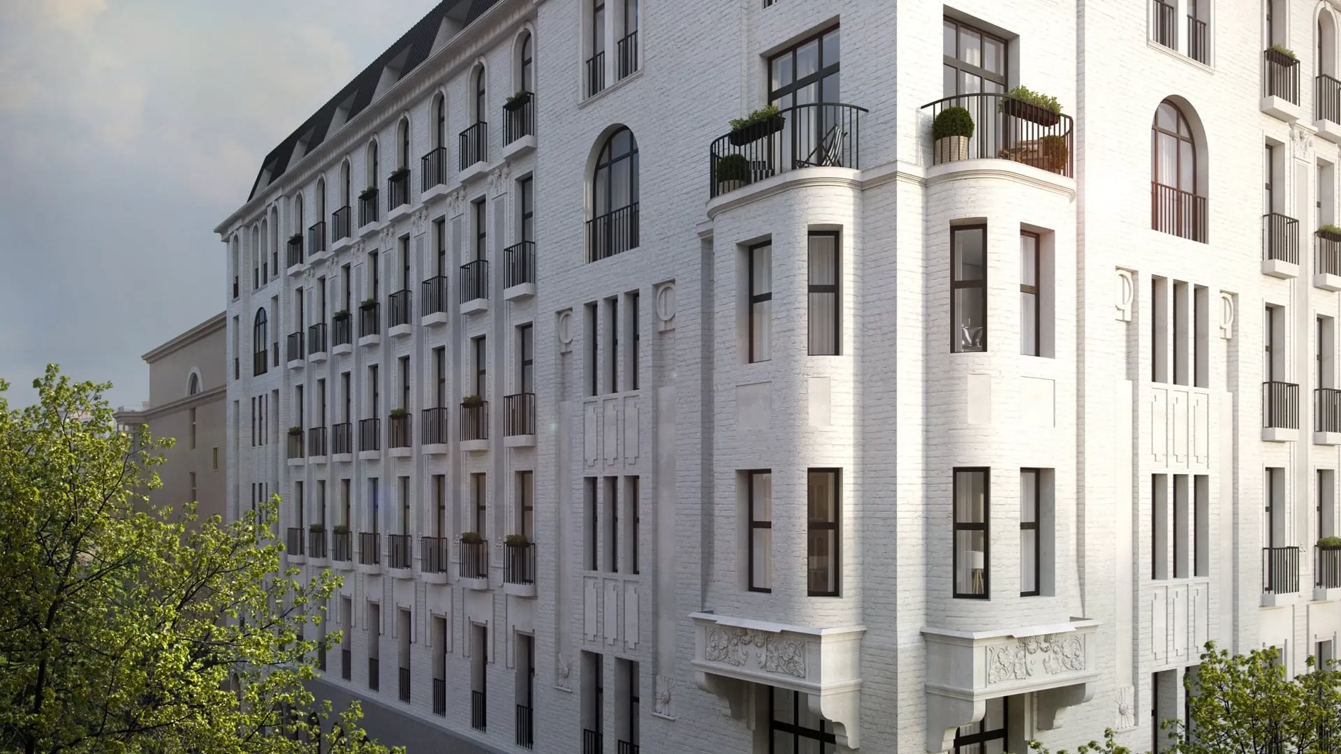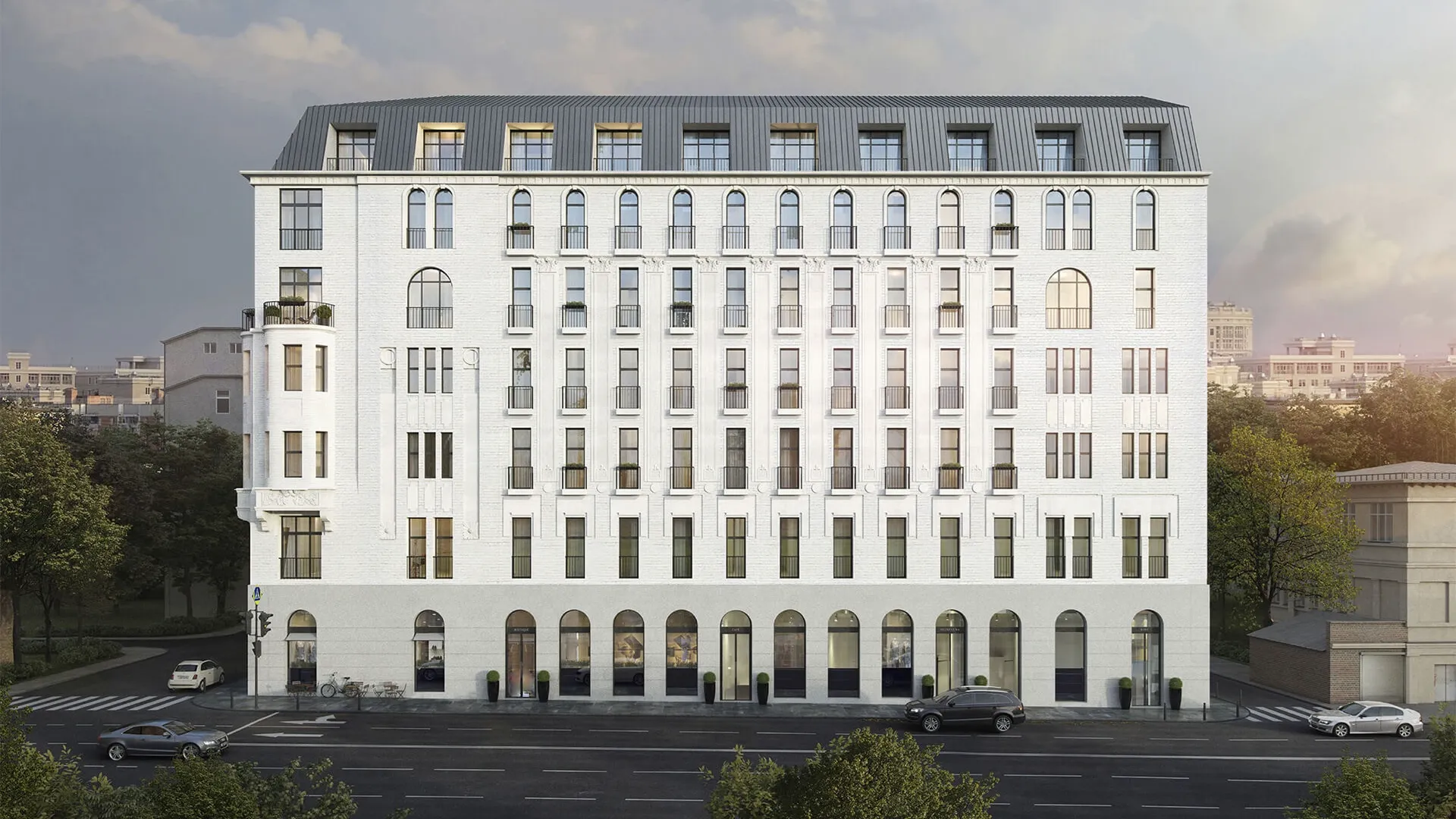 Проект представляет собой реновацию исторического здания с белоснежным фасадом в стиле неомодерн, украшенным арочными окнами, французскими балконами и декоративными эркерами.