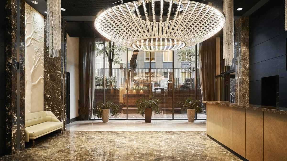 Парадные входы ведут в общее лобби с лифтовыми холлами.
