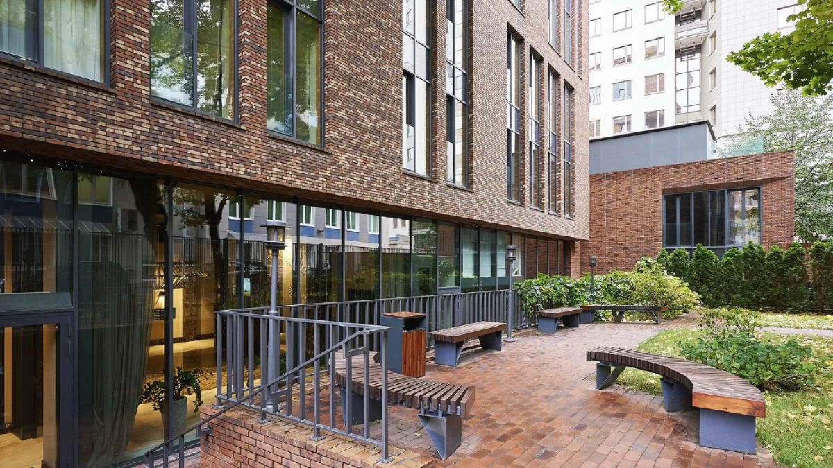 Во дворе клубного дома «Бурденко» создан закрытый зелёный сад с современным ландшафтным дизайном.